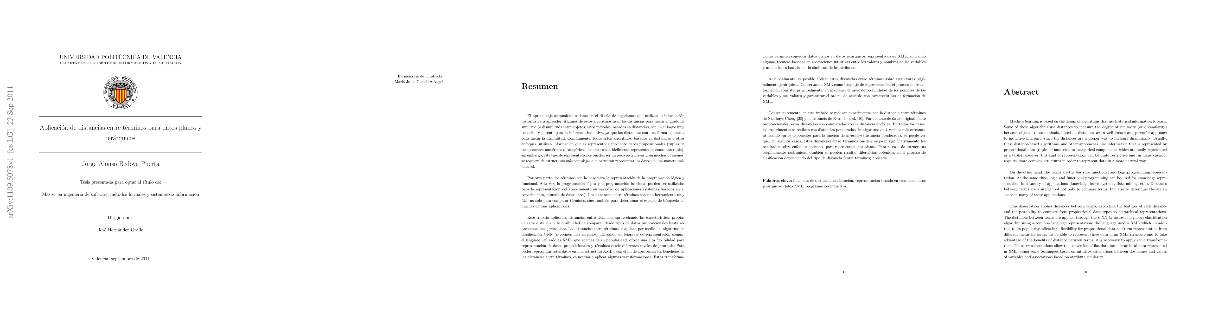 In machine learning, distance-based algorithms, and other approaches, use information that is represented by propositional data. However, this kind of representation can be quite restrictive and, in many cases, it requires more complex structures in order to represent data in a more natural way. Terms are the basis for functional and logic programming representation. Distances between terms are a useful tool not only to compare terms, but also to determine the search space in many of these applications. This dissertation applies distances between terms, exploiting the features of each distance and the possibility to compare from propositional data types to hierarchical representations. The distances between terms are applied through the k-NN (k-nearest neighbor) classification algorithm using XML as a common language representation. To be able to represent these data in an XML structure and to take advantage of the benefits of distance between terms, it is necessary to apply some transformations. These transformations allow the conversion of flat data into hierarchical data represented in XML, using some techniques based on intuitive associations between the names and values of variables and associations based on attribute similarity. Several experiments with the distances between terms of Nienhuys-Cheng and Estruch et al. were performed. In the case of originally propositional data, these distances are compared to the Euclidean distance. In all cases, the experiments were performed with the distance-weighted k-nearest neighbor algorithm, using several exponents for the attraction function (weighted distance). It can be seen that in some cases, the term distances can significantly improve the results on approaches applied to flat representations.