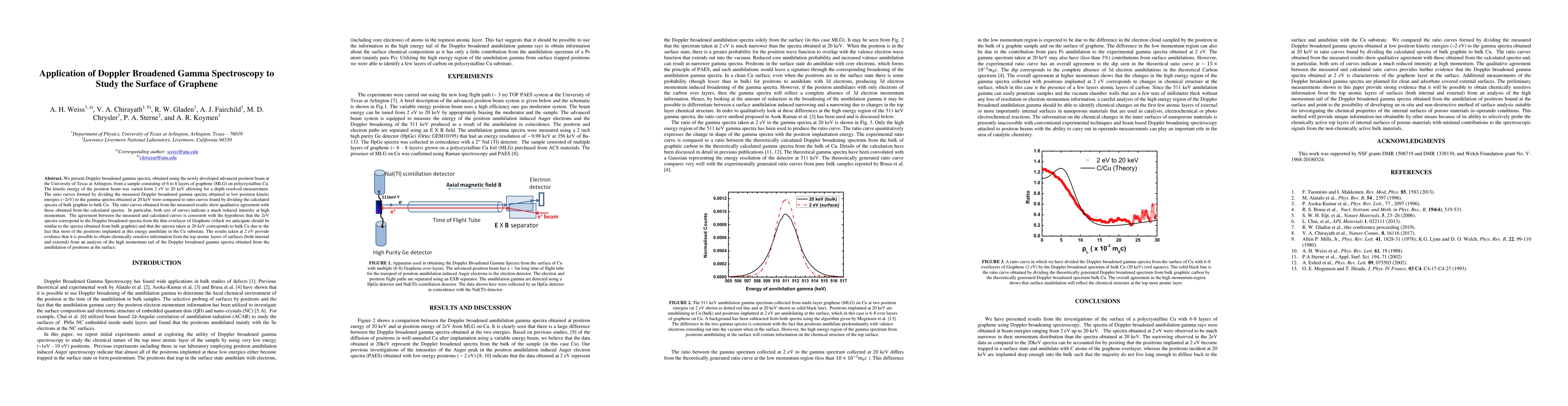 We present Doppler broadened gamma spectra, obtained using the newly developed advanced positron beam at the University of Texas at Arlington, from a sample consisting of 6 to 8 layers of graphene (MLG) on polycrystalline Cu. The kinetic energy of the positron beam was varied form 2 eV to 20 keV allowing for a depth resolved measurement. The ratio curves formed by dividing the measured Doppler broadened gamma spectra obtained at low positron kinetic energies (~2eV) to the gamma spectra obtained at 20 keV were compared to ratio curves found by dividing the calculated spectra of bulk graphite to bulk Cu. The ratio curves obtained from the measured results show qualitative agreement with those obtained from the calculated spectra. In particular, both sets of curves indicate a much reduced intensity at high momentum. The agreement between the measured and calculated curves is consistent with the hypothesis that the 2eV spectra correspond to the Doppler broadened spectra from the thin overlayer of Graphene (which we anticipate should be similar to the spectra obtained from bulk graphite) and that the spectra taken at 20 keV corresponds to bulk Cu due to the fact that most of the positrons implanted at this energy annihilate in the Cu substrate. The results taken at 2 eV provide evidence that it is possible to obtain chemically sensitive information from the top atomic layers of surfaces (both internal and external) from an analysis of the high momentum tail of the Doppler broadened gamma spectra obtained from the annihilation of positrons at the surface.