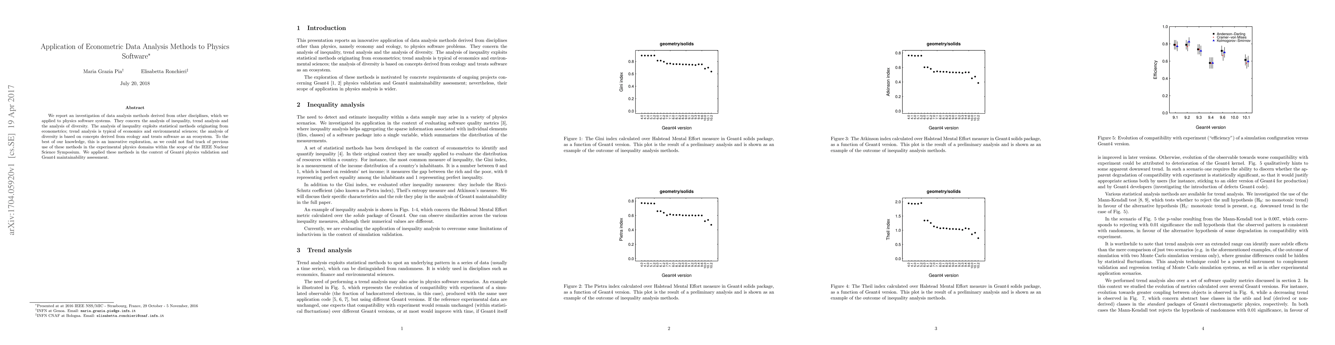 We report an investigation of data analysis methods derived from other disciplines, which we applied to physics software systems. They concern the analysis of inequality, trend analysis and the analysis of diversity. The analysis of inequality exploits statistical methods originating from econometrics; trend analysis is typical of economics and environmental sciences; the analysis of diversity is based on concepts derived from ecology and treats software as an ecosystem. To the best of our knowledge, this is an innovative exploration, as we could not find track of previous use of these methods in the experimental physics domains within the scope of the IEEE Nuclear Science Symposium. We applied these methods in the context of Geant4 physics validation and Geant4 maintainability assessment.