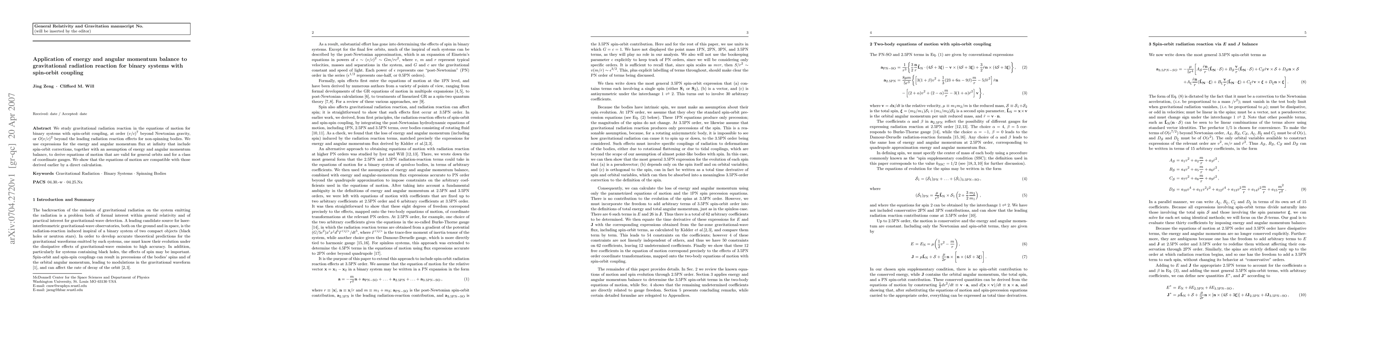 This paper develops equations of motion for binary systems with spin-orbit coupling, incorporating gravitational radiation reaction at a high post-Newtonian order. It uses energy and angular momentum balance to derive these equations, showing compatibility with previous results.