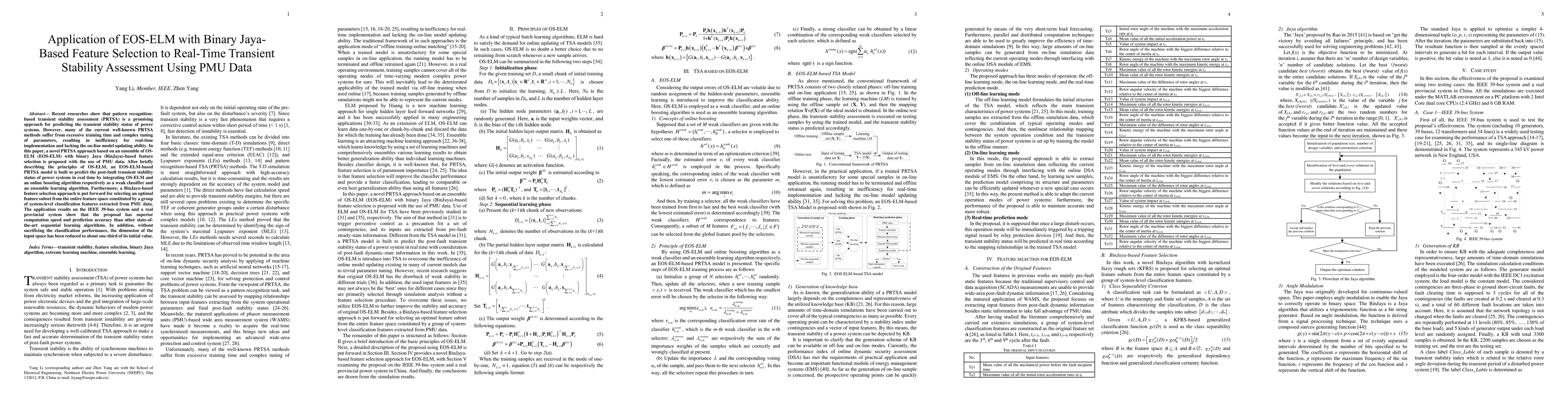 Recent studies show that pattern-recognition-based transient stability assessment (PRTSA) is a promising approach for predicting the transient stability status of power systems. However, many of the current well-known PRTSA methods suffer from excessive training time and complex tuning of parameters, resulting in inefficiency for real-time implementation and lacking the online model updating ability. In this paper, a novel PRTSA approach based on an ensemble of OS-extreme learning machine (EOSELM) with binary Jaya (BinJaya)-based feature selection is proposed with the use of phasor measurement units (PMUs) data. After briefly describing the principles of OS-ELM, an EOS-ELM-based PRTSA model is built to predict the post-fault transient stability status of power systems in real time by integrating OS-ELM and an online boosting algorithm, respectively, as a weak classifier and an ensemble learning algorithm. Furthermore, a BinJaya-based feature selection approach is put forward for selecting an optimal feature subset from the entire feature space constituted by a group of system-level classification features extracted from PMU data. The application results on the IEEE 39-bus system and a real provincial system show that the proposal has superior computation speed and prediction accuracy than other state-of-the-art sequential learning algorithms. In addition, without sacrificing the classification performance, the dimension of the input space has been reduced to about one-third of its initial value.