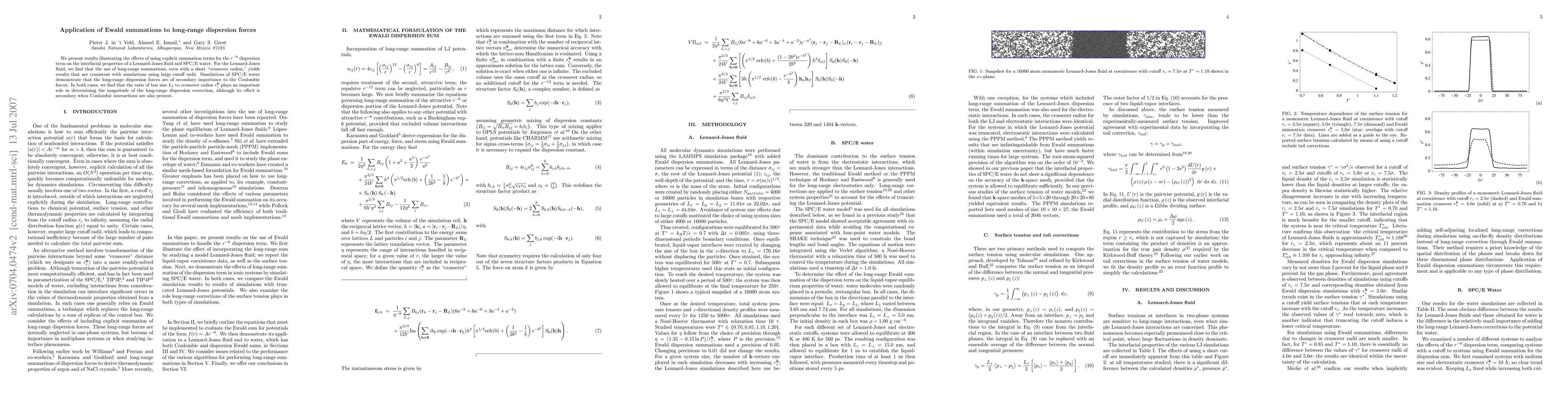 This paper investigates the application of Ewald summations for long-range $r^{-6}$ dispersion forces in Lennard-Jones fluids and SPC/E water, finding consistent results with large cutoff radii. It concludes that long-range dispersion forces are less significant than Coulombic forces in SPC/E water, and the ratio of box size to crossover radius significantly influences dispersion correction magnitude.