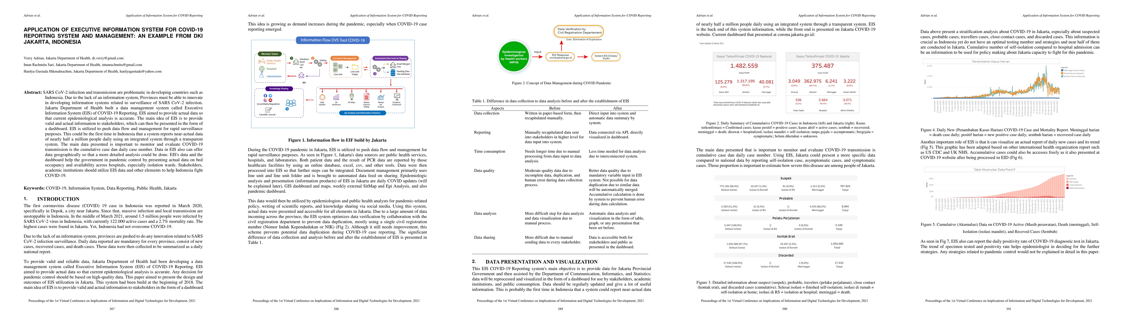 SARS CoV-2 infection and transmission are problematic in developing countries such as Indonesia. Due to the lack of an information system, Provinces must be able to innovate in developing information systems related to surveillance of SARS CoV-2 infection. Jakarta Department of Health built a data management system called Executive Information System (EIS) of COVID-19 Reporting. EIS aimed to provide actual data so that current epidemiological analysis is accurate. The main idea of EIS is to provide valid and actual information to stakeholders, which can then be presented in the form of a dashboard. EIS is utilized to push data flow and management for rapid surveillance purposes. This could be the first time in Indonesia that a system reports near-actual data of nearly half a million people daily using an integrated system through a transparent system. The main data presented is important to monitor and evaluate COVID-19 transmission is the cumulative case dan daily case number. Data in EIS also can offer data geographically so that a more detailed analysis could be done. EIS's data and the dashboard help the government in pandemic control by presenting actual data on bed occupancy and availability across hospitals, especially isolation wards. Stakeholders, academic institutions should utilize EIS data and other elements to help Indonesia fight COVID-19.