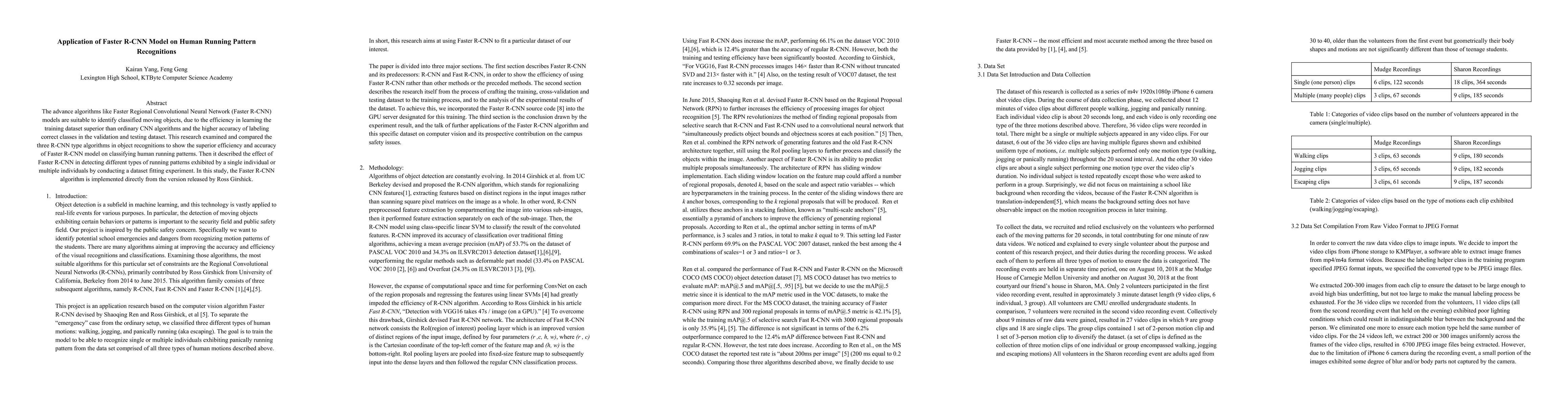 The advance algorithms like Faster Regional Convolutional Neural Network (Faster R-CNN) models are suitable to identify classified moving objects, due to the efficiency in learning the training dataset superior than ordinary CNN algorithms and the higher accuracy of labeling correct classes in the validation and testing dataset. This research examined and compared the three R-CNN type algorithms in object recognition to show the superior efficiency and accuracy of Faster R-CNN model on classifying human running patterns. Then it described the effect of Faster R-CNN in detecting different types of running patterns exhibited by a single individual or multiple individuals by conducting a dataset fitting experiment. In this study, the Faster R-CNN algorithm is implemented directly from the version released by Ross Girshick.