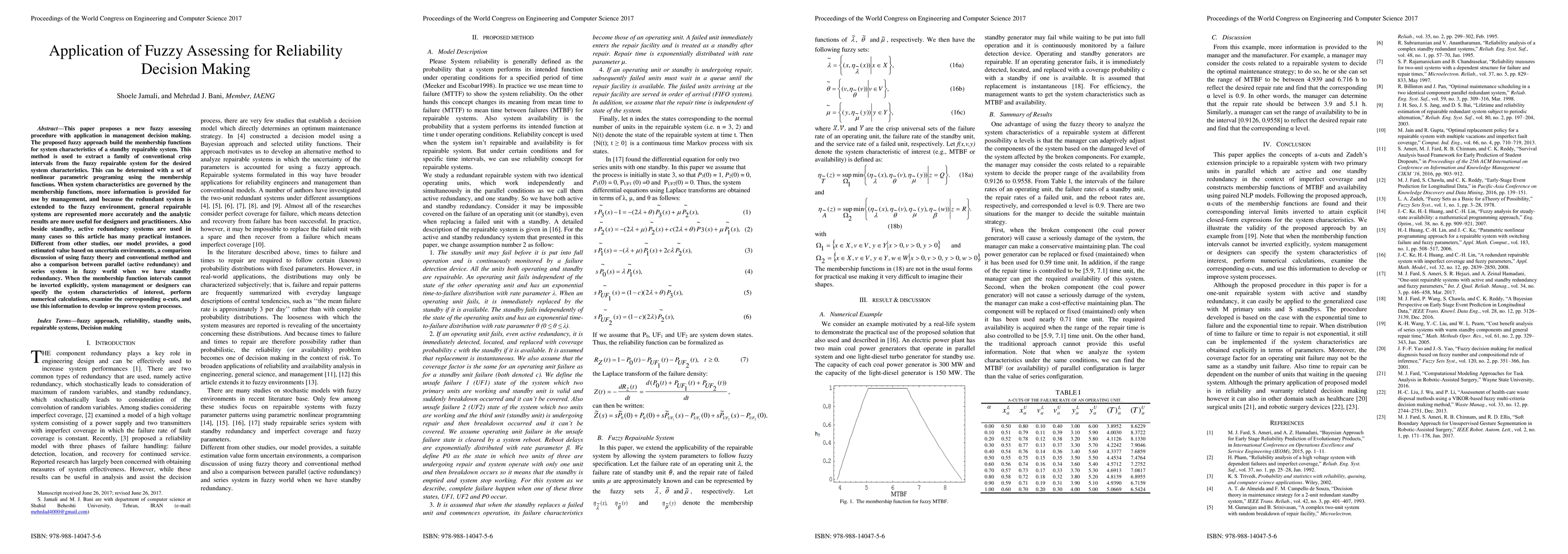 This paper proposes a fuzzy assessing procedure for management decision making in reliability, using membership functions for standby repairable systems to extract crisp intervals. The method provides more accurate representations and useful analytic results compared to conventional methods, especially for active redundancy systems.