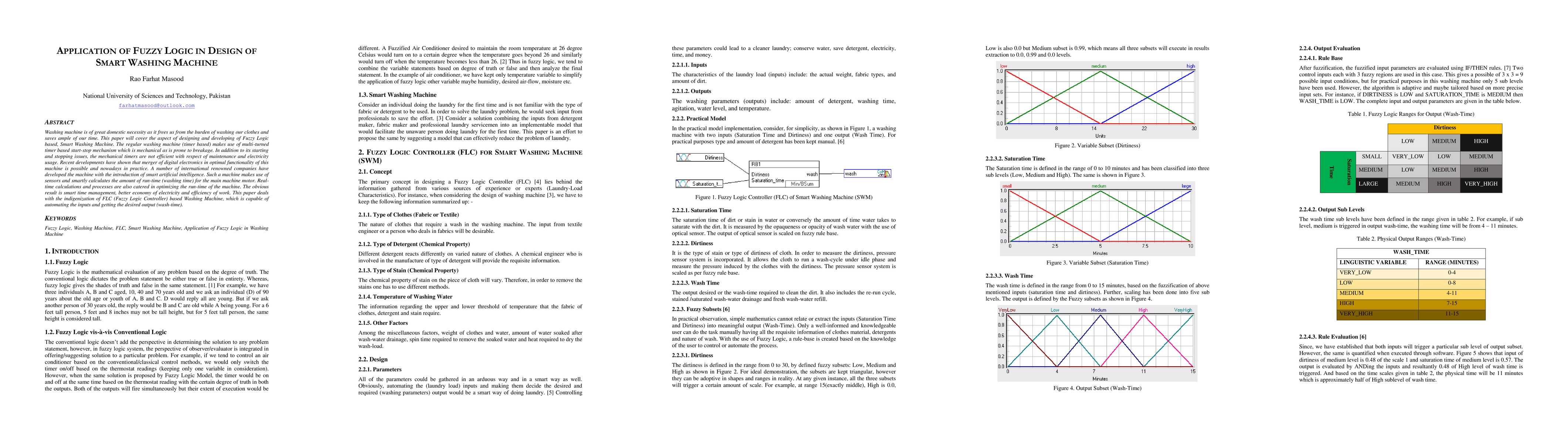 Washing machine is of great domestic necessity as it frees us from the burden of washing our clothes and saves ample of our time. This paper will cover the aspect of designing and developing of Fuzzy Logic based, Smart Washing Machine. The regular washing machine (timer based) makes use of multi-turned timer based start-stop mechanism which is mechanical as is prone to breakage. In addition to its starting and stopping issues, the mechanical timers are not efficient with respect of maintenance and electricity usage. Recent developments have shown that merger of digital electronics in optimal functionality of this machine is possible and nowadays in practice. A number of international renowned companies have developed the machine with the introduction of smart artificial intelligence. Such a machine makes use of sensors and smartly calculates the amount of run-time (washing time) for the main machine motor. Realtime calculations and processes are also catered in optimizing the run-time of the machine. The obvious result is smart time management, better economy of electricity and efficiency of work. This paper deals with the indigenization of FLC (Fuzzy Logic Controller) based Washing Machine, which is capable of automating the inputs and getting the desired output (wash-time).