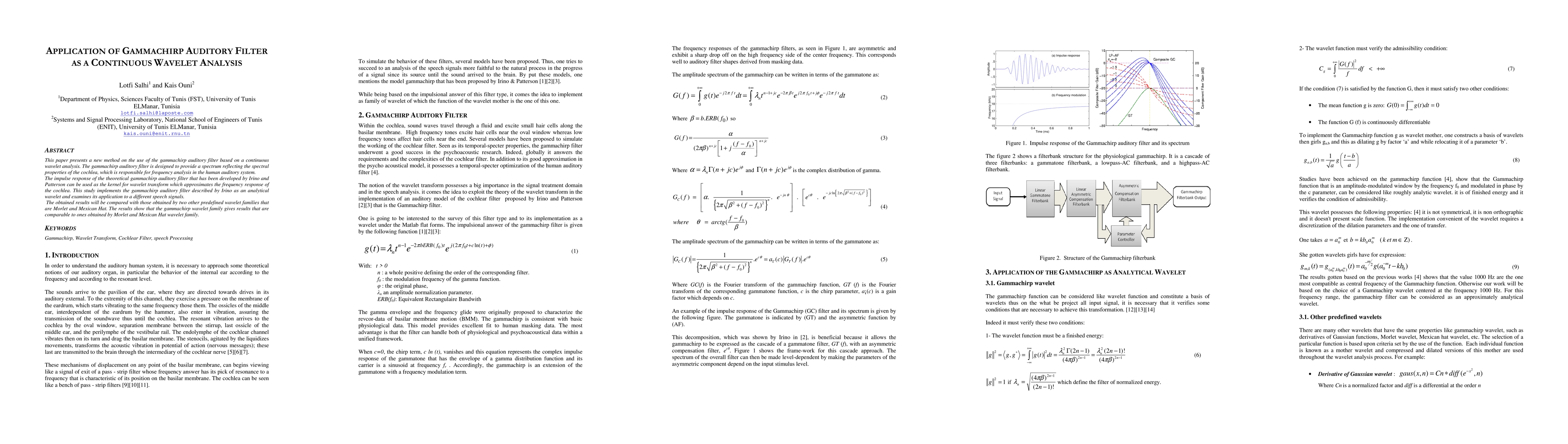 This paper introduces a gammachirp auditory filter as a continuous wavelet analysis tool, showing its effectiveness in analyzing speech signals. Comparative results indicate that the gammachirp wavelet family performs comparably to established Morlet and Mexican Hat wavelet families.