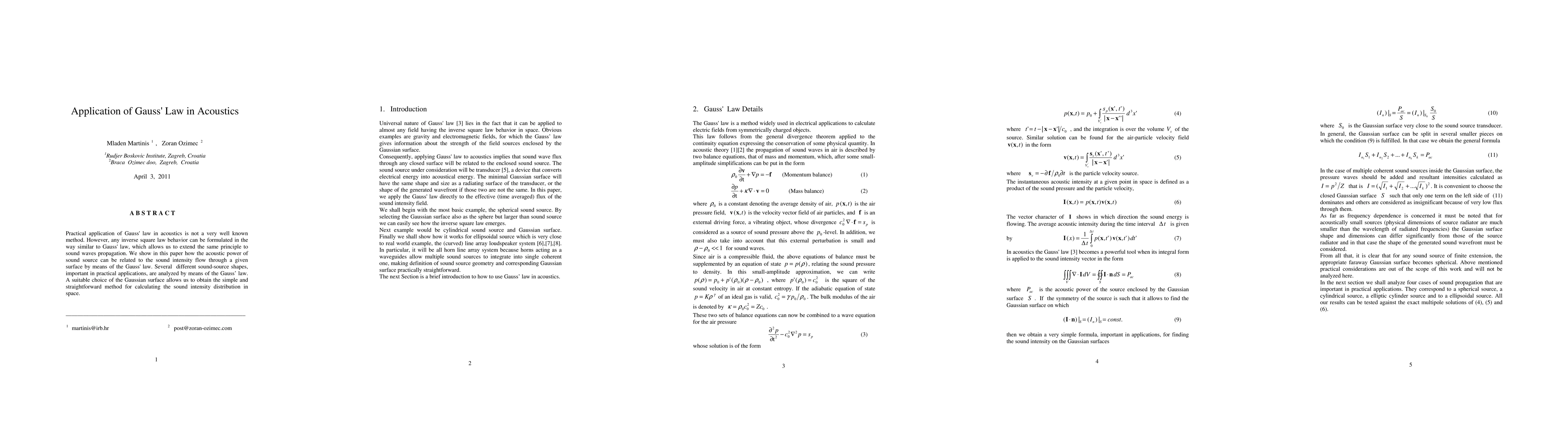 This paper demonstrates the application of Gauss' law to acoustics, showing how it can relate the acoustic power of a sound source to the sound intensity flow through a given surface. It analyzes various practical sound-source shapes using Gauss' law to derive a simple method for calculating sound intensity distribution in space.