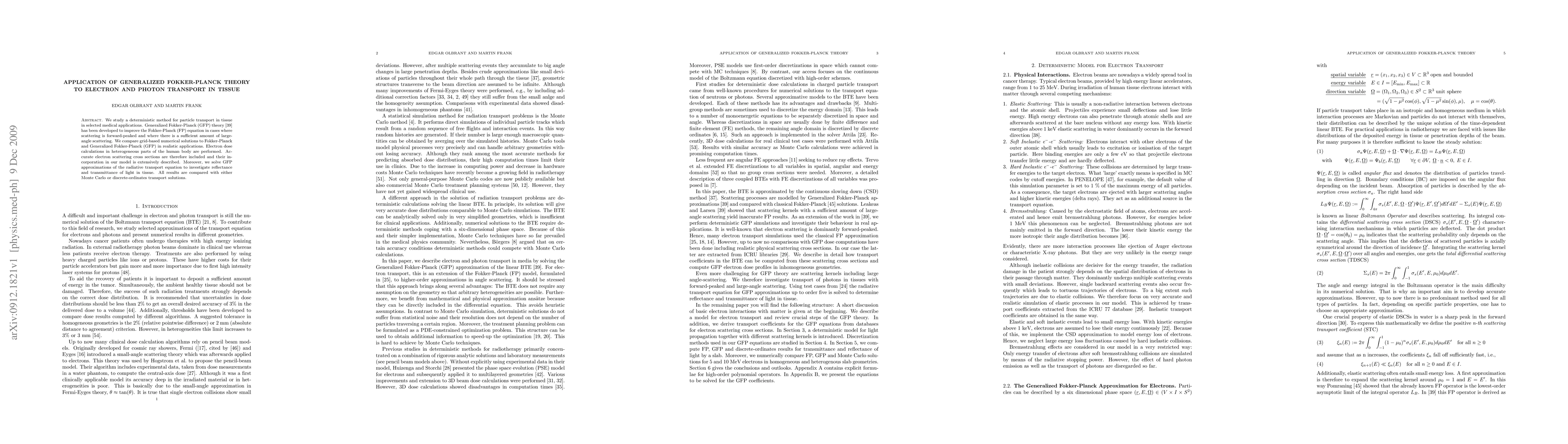 This paper applies Generalized Fokker-Planck theory to improve electron and photon transport modeling in tissue, comparing its grid-based numerical solutions to traditional Fokker-Planck and Monte Carlo methods. The study includes detailed electron dose calculations and light reflectance/transmittance in tissue.
