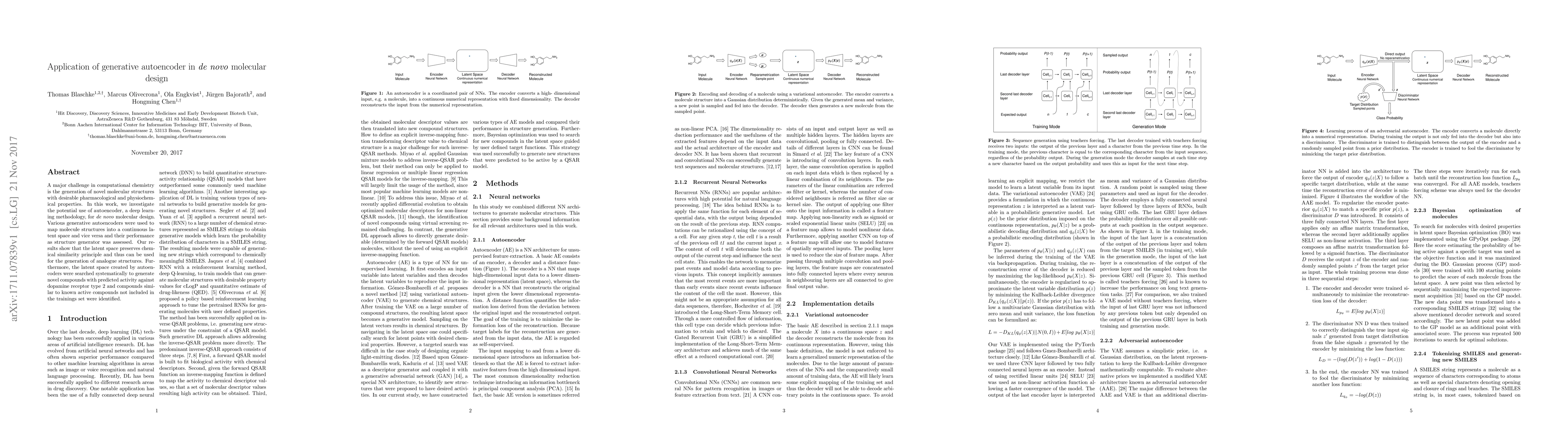 This paper explores the use of generative autoencoders for de novo molecular design, demonstrating that the latent space preserves chemical similarity, enabling the generation of novel compounds with desired pharmacological properties. The study successfully identifies novel compounds with predicted activity against dopamine receptor type 2.