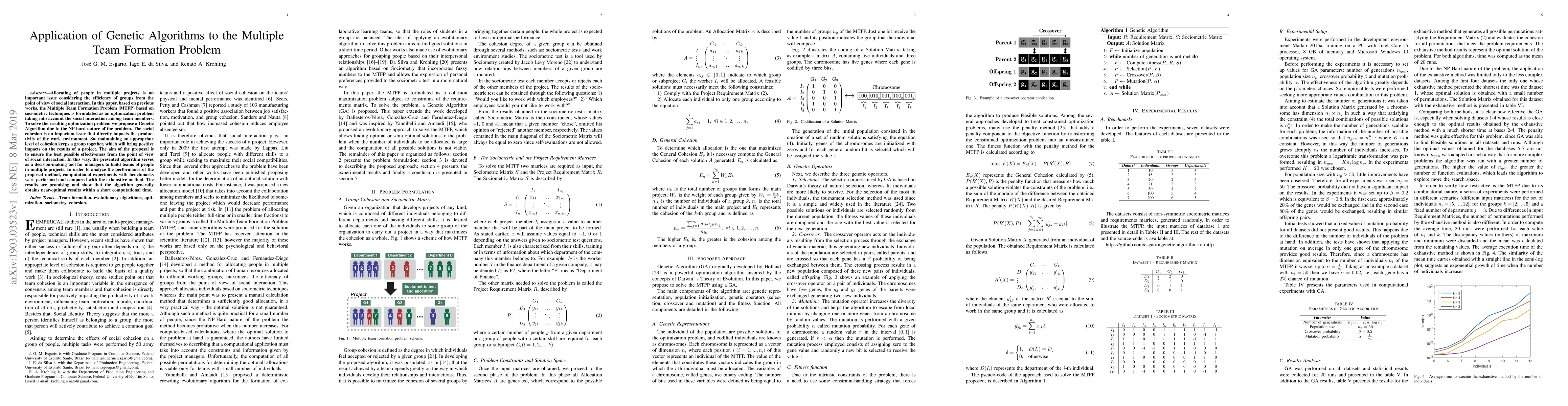 This paper proposes a Genetic Algorithm to solve the Multiple Team Formation Problem (MTFP), optimizing team composition based on social interaction metrics. Computational experiments show promising near-optimal results with reduced computation time compared to exhaustive methods.