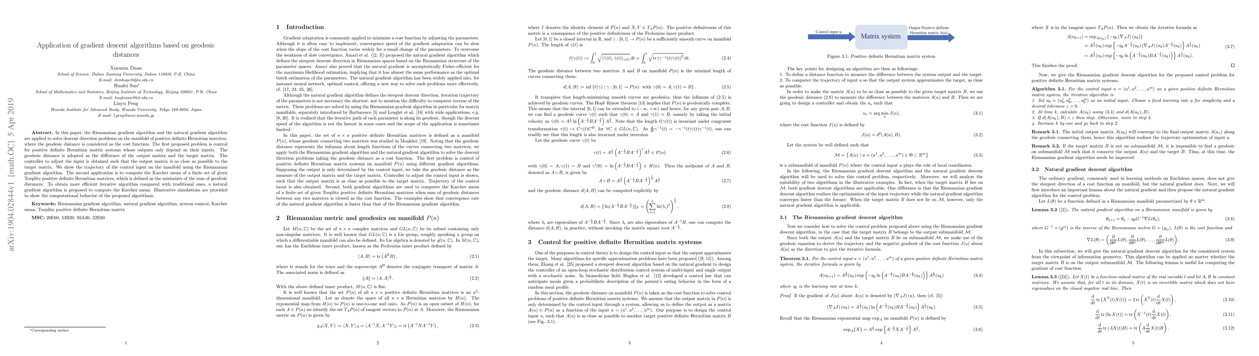 In this paper, the Riemannian gradient algorithm and the natural gradient algorithm are applied to solve descent direction problems on the manifold of positive definite Hermitian matrices, where the geodesic distance is considered as the cost function. The first proposed problem is control for positive definite Hermitian matrix systems whose outputs only depend on their inputs. The geodesic distance is adopted as the difference of the output matrix and the target matrix. The controller to adjust the input is obtained such that the output matrix is as close as possible to the target matrix. We show the trajectory of the control input on the manifold using the Riemannian gradient algorithm. The second application is to compute the Karcher mean of a finite set of given Toeplitz positive definite Hermitian matrices, which is defined as the minimizer of the sum of geodesic distances. To obtain more efficient iterative algorithm compared with traditional ones, a natural gradient algorithm is proposed to compute the Karcher mean. Illustrative simulations are provided to show the computational behavior of the proposed algorithms.