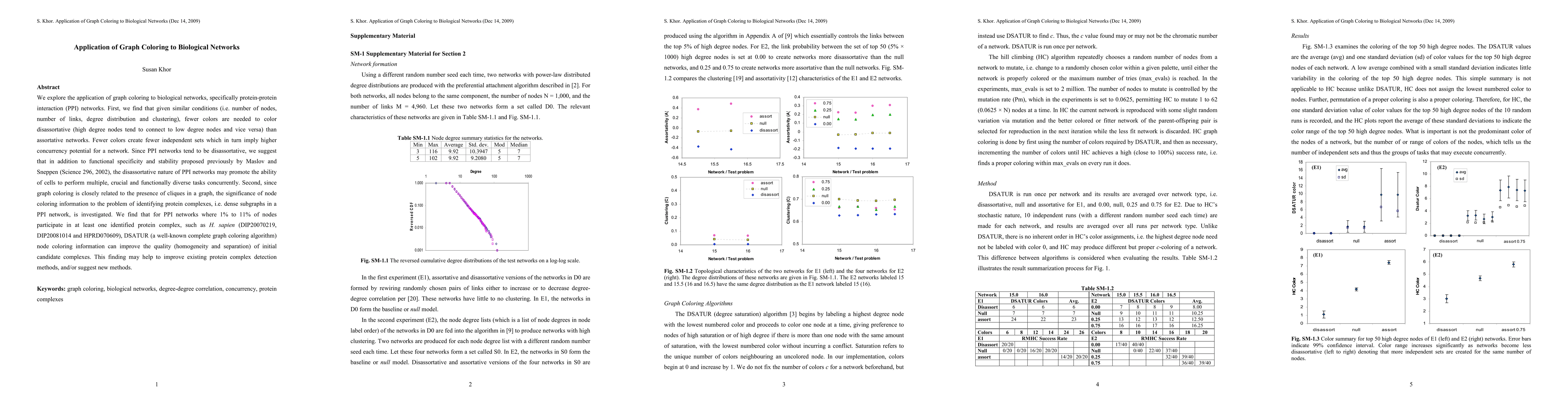 We explore the application of graph coloring to biological networks, specifically protein-protein interaction (PPI) networks. First, we find that given similar conditions (i.e. number of nodes, number of links, degree distribution and clustering), fewer colors are needed to color disassortative (high degree nodes tend to connect to low degree nodes and vice versa) than assortative networks. Fewer colors create fewer independent sets which in turn imply higher concurrency potential for a network. Since PPI networks tend to be disassortative, we suggest that in addition to functional specificity and stability proposed previously by Maslov and Sneppen (Science 296, 2002), the disassortative nature of PPI networks may promote the ability of cells to perform multiple, crucial and functionally diverse tasks concurrently. Second, since graph coloring is closely related to the presence of cliques in a graph, the significance of node coloring information to the problem of identifying protein complexes, i.e. dense subgraphs in a PPI network, is investigated. We find that for PPI networks where 1% to 11% of nodes participate in at least one identified protein complex, such as H. sapien (DIP20070219, DIP20081014 and HPRD070609), DSATUR (a well-known complete graph coloring algorithm) node coloring information can improve the quality (homogeneity and separation) of initial candidate complexes. This finding may help to improve existing protein complex detection methods, and/or suggest new methods.