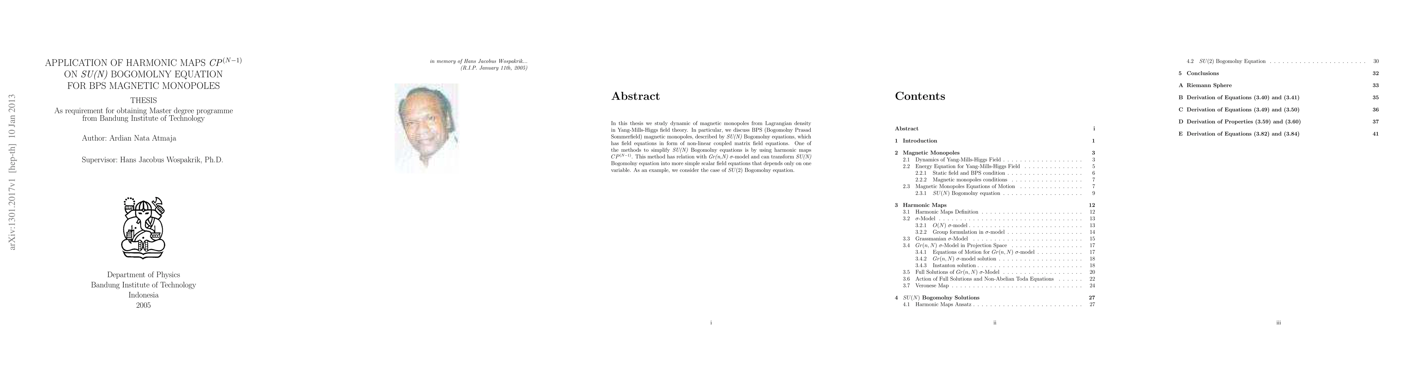 In this thesis we study dynamic of magnetic monopoles from Lagrangian density in Yang-Mills-Higgs field theory. In particular, we discuss BPS (Bogomolny Prasad Sommerfield) magnetic monopoles, described by SU(N) Bogomolny equations, which has field equations in form of non-linear coupled matrix field equations. One of the methods to simplify SU(N) Bogomolny equations is by using harmonic maps $CP^{(N-1)}$. This method has relation with $Gr(n,N)} \sigma$-model and can transform SU(N) Bogomolny equation into more simple scalar field equations that depends only on one variable. As an example, we consider the case of SU(2) Bogomolny equation.