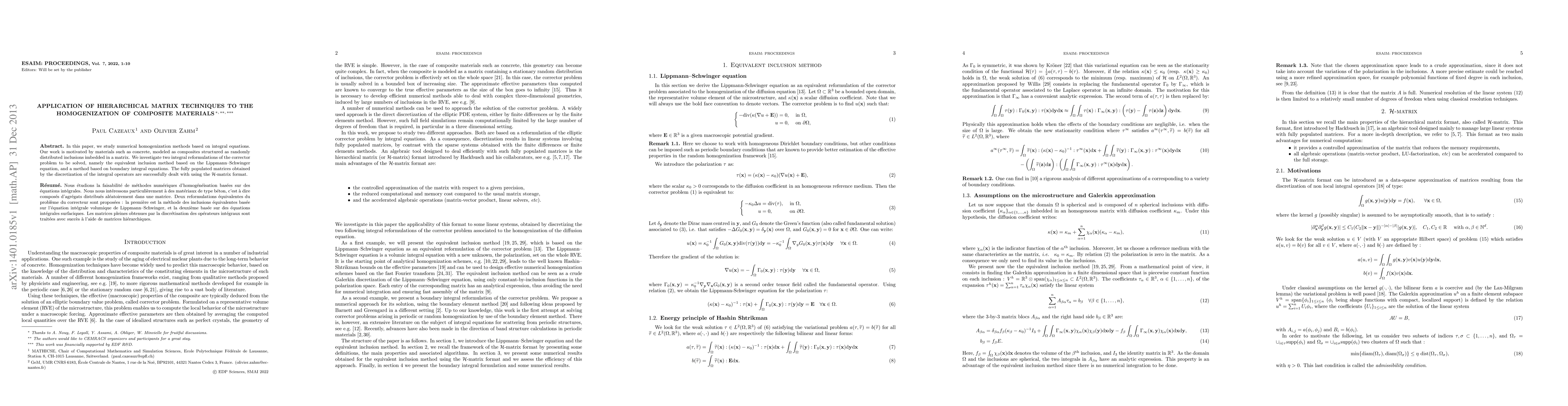 This paper applies hierarchical matrix techniques to improve numerical homogenization methods for composite materials, offering a more efficient approach for modeling randomly distributed inclusions in matrices.