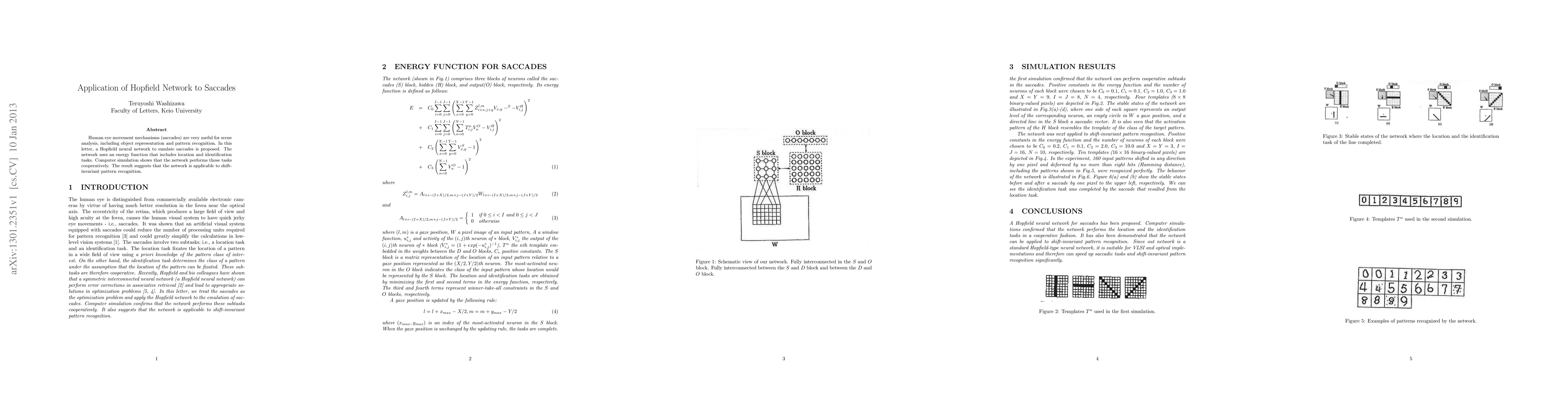 Human eye movement mechanisms (saccades) are very useful for scene analysis, including object representation and pattern recognition. In this letter, a Hopfield neural network to emulate saccades is proposed. The network uses an energy function that includes location and identification tasks. Computer simulation shows that the network performs those tasks cooperatively. The result suggests that the network is applicable to shift-invariant pattern recognition.