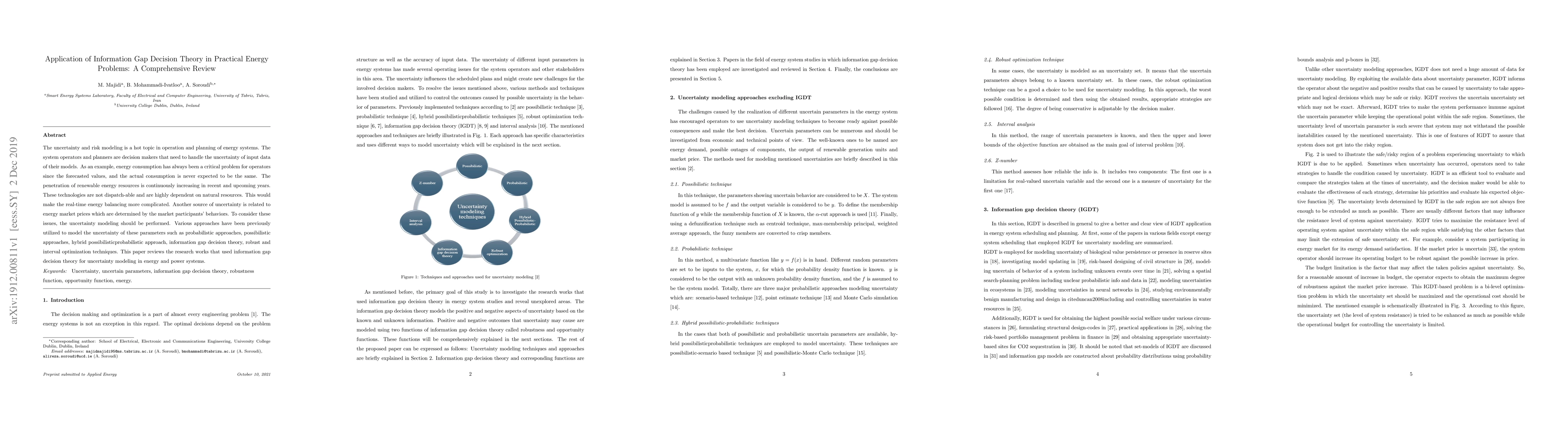 This paper reviews how information gap decision theory is used to model uncertainty in energy systems, including renewable energy sources and market prices, to improve operation and planning decisions. It highlights the importance of uncertainty modeling in addressing challenges such as real-time energy balancing.