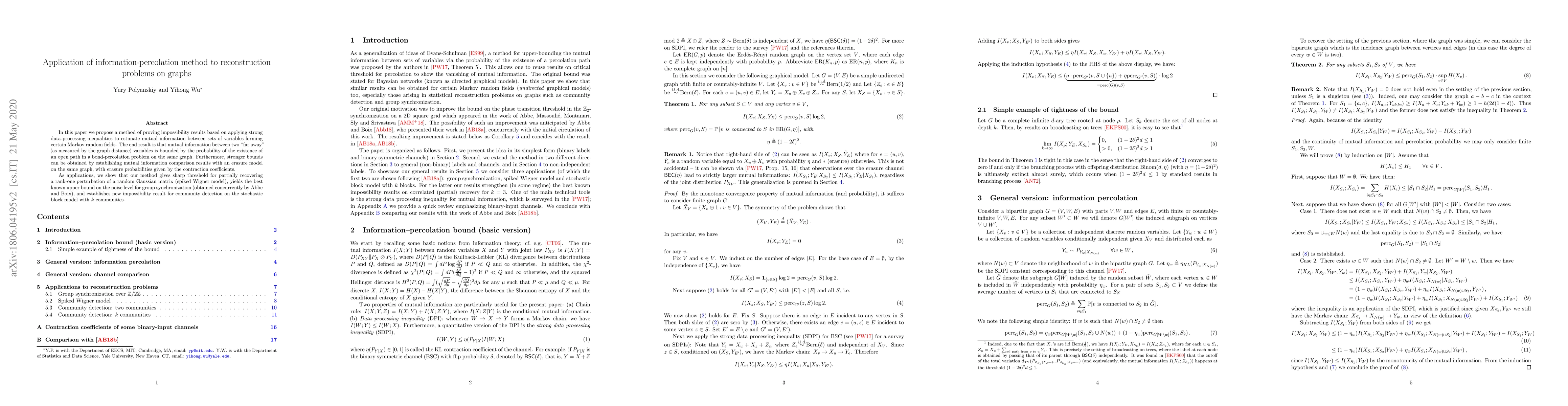 In this paper we propose a method of proving impossibility results based on applying strong data-processing inequalities to estimate mutual information between sets of variables forming certain Markov random fields. The end result is that mutual information between two "far away" (as measured by the graph distance) variables is bounded by the probability of the existence of an open path in a bond-percolation problem on the same graph. Furthermore, stronger bounds can be obtained by establishing mutual information comparison results with an erasure model on the same graph, with erasure probabilities given by the contraction coefficients. As applications, we show that our method gives sharp threshold for partially recovering a rank-one perturbation of a random Gaussian matrix (spiked Wigner model), yields the best known upper bound on the noise level for group synchronization (obtained concurrently by Abbe and Boix), and establishes new impossibility result for community detection on the stochastic block model with $k$ communities.