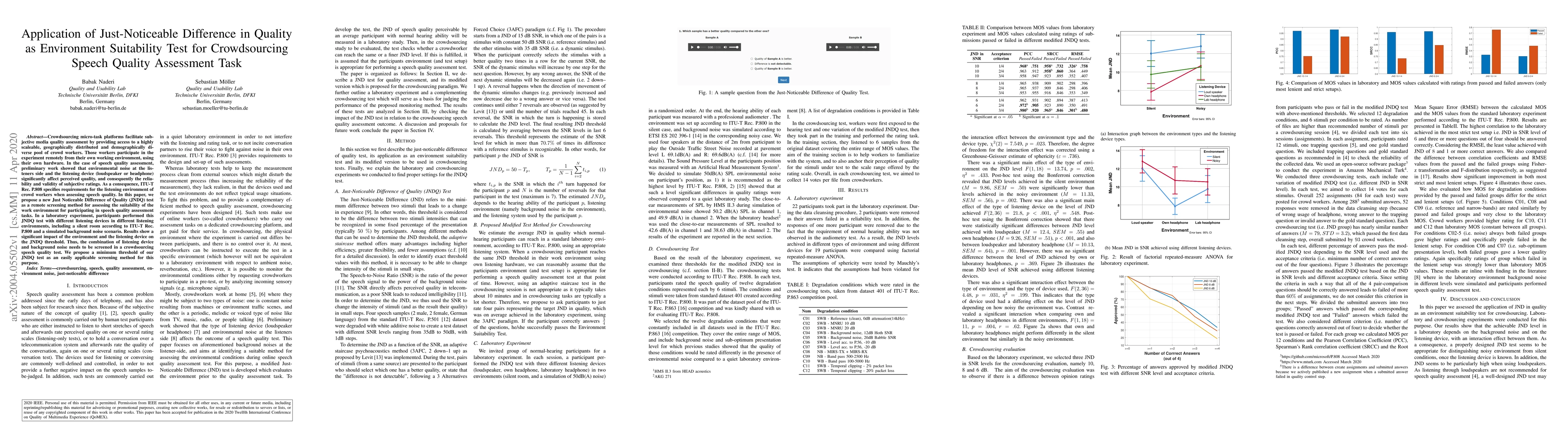 This paper proposes a Just Noticeable Difference of Quality (JNDQ) test to screen the suitability of crowd workers' environments for assessing speech quality in crowdsourcing tasks. Results from a laboratory experiment indicate significant environmental and device impacts on the JNDQ threshold, suggesting a need for screening combinations of listening devices and background noise in such tests.