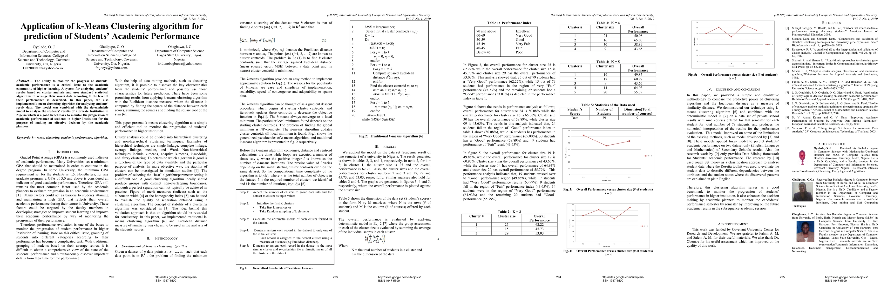 This paper applies the k-means clustering algorithm to analyze and predict students' academic performance in a Nigerian private institution. The results provide a benchmark for academic planners to make informed decisions regarding student progression.