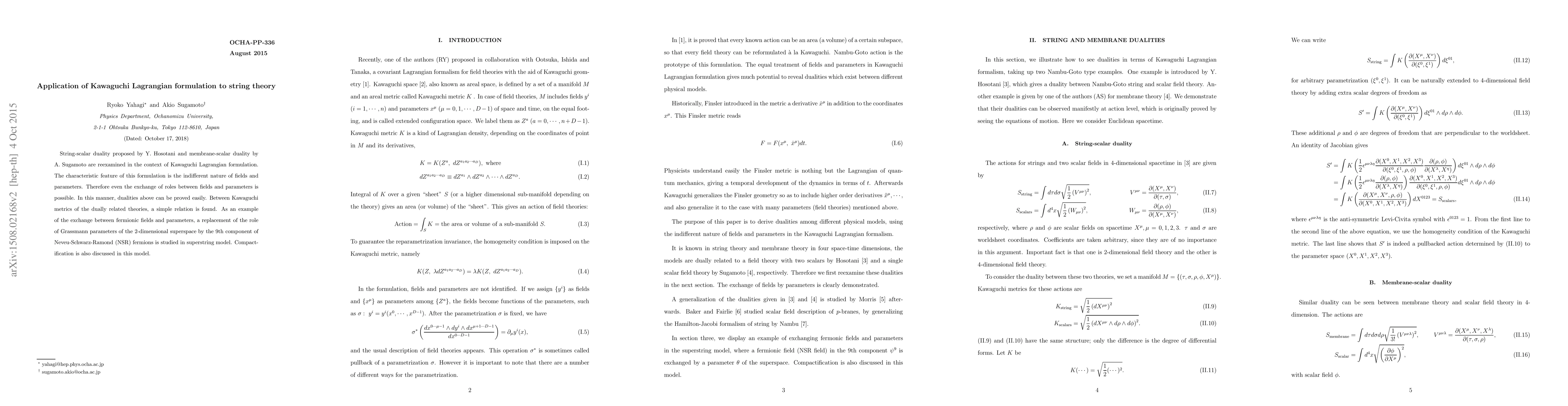 String-scalar duality proposed by Y. Hosotani and membrane-scalar duality by A. Sugamoto are reexamined in the context of Kawaguchi Lagrangian formulation. The characteristic feature of this formulation is the indifferent nature of fields and parameters. Therefore even the exchange of roles between fields and parameters is possible. In this manner, dualities above can be proved easily. Between Kawaguchi metrics of the dually related theories, a simple relation is found. As an example of the exchange between fermionic fields and parameters, a replacement of the role of Grassmann parameters of the 2-dimensional superspace by the 9th component of Neveu-Schwarz-Ramond (NSR) fermions is studied in superstring model. Compactification is also discussed in this model.