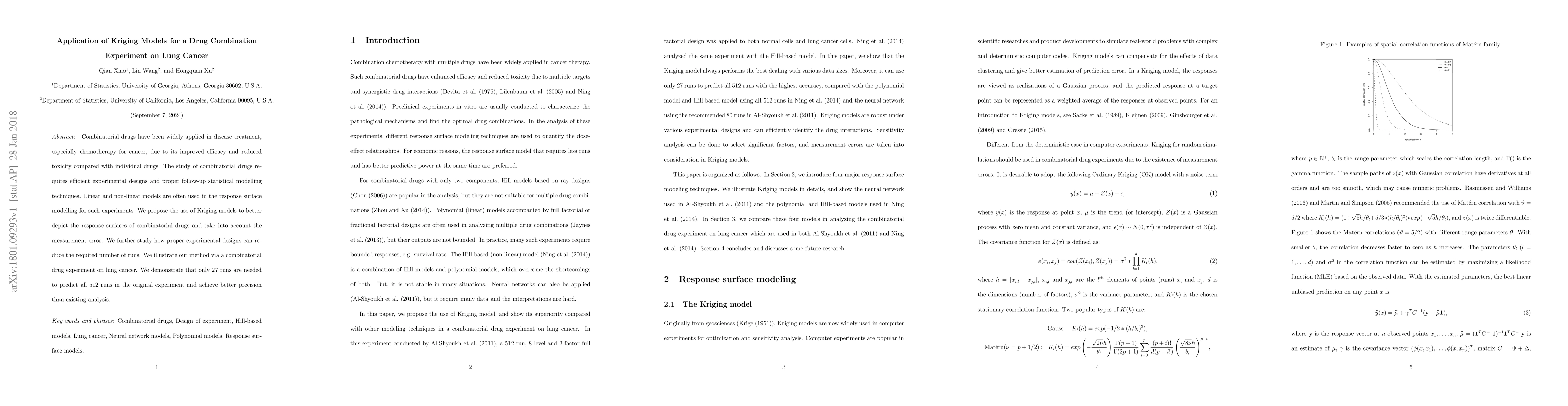 This paper proposes using Kriging models to analyze the response surfaces of combinatorial drug experiments for lung cancer, showing that it requires fewer runs (27) compared to the original 512 while achieving better precision. The study highlights the efficiency of proper experimental designs and the effectiveness of Kriging models in accounting for measurement errors.