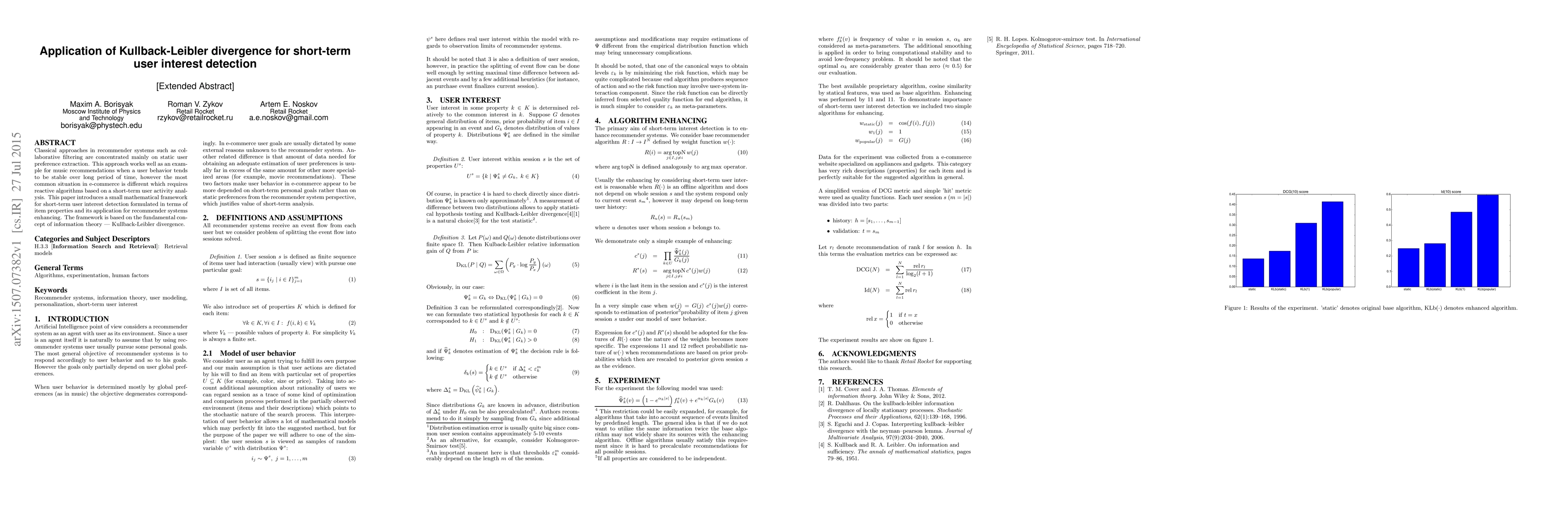 Classical approaches in recommender systems such as collaborative filtering are concentrated mainly on static user preference extraction. This approach works well as an example for music recommendations when a user behavior tends to be stable over long period of time, however the most common situation in e-commerce is different which requires reactive algorithms based on a short-term user activity analysis. This paper introduces a small mathematical framework for short-term user interest detection formulated in terms of item properties and its application for recommender systems enhancing. The framework is based on the fundamental concept of information theory --- Kullback-Leibler divergence.