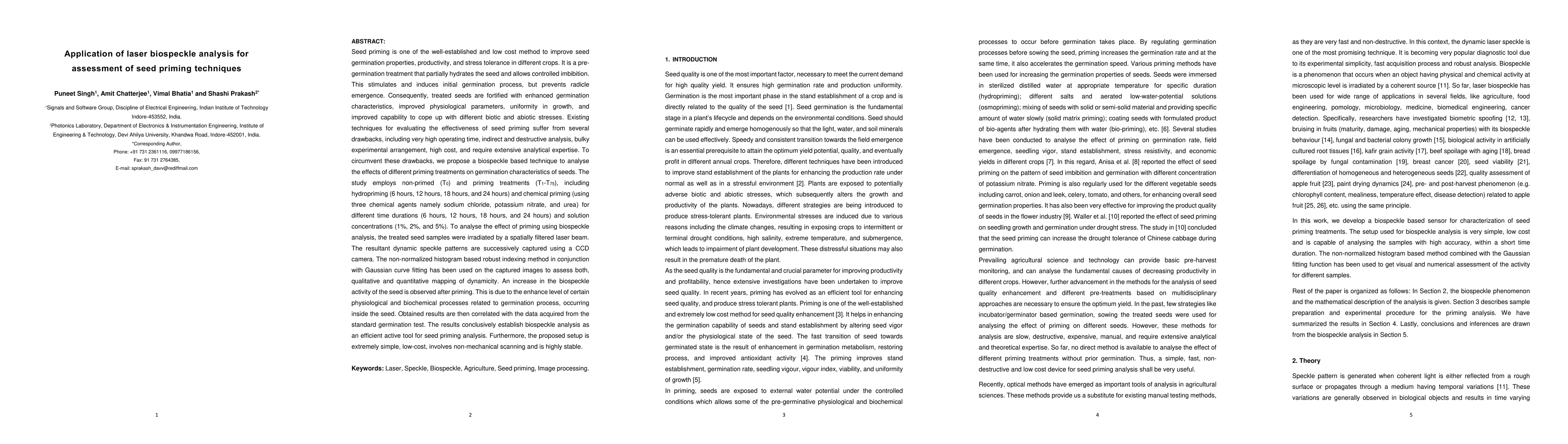 Seed priming is one of the well-established and low cost method to improve seed germination properties, productivity, and stress tolerance in different crops. It is a pre-germination treatment that partially hydrates the seed and allows controlled imbibition. This stimulates and induces initial germination process, but prevents radicle emergence. Consequently, treated seeds are fortified with enhanced germination characteristics, improved physiological parameters, uniformity in growth, and improved capability to cope up with different biotic and abiotic stresses. Existing techniques for evaluating the effectiveness of seed priming suffer from several drawbacks, including very high operating time, indirect and destructive analysis, bulky experimental arrangement, high cost, and require extensive analytical expertise. To circumvent these drawbacks, we propose a biospeckle based technique to analyse the effects of different priming treatments on germination characteristics of seeds. The study employs non-primed (T0) and priming treatments (T1-T75), including hydropriming and chemical priming (using three chemical agents namely sodium chloride, potassium nitrate, and urea) for different time durations and solution concentrations. The results conclusively establish biospeckle analysis as an efficient active tool for seed priming analysis. Furthermore, the proposed setup is extremely simple, low-cost, involves non-mechanical scanning and is highly stable.