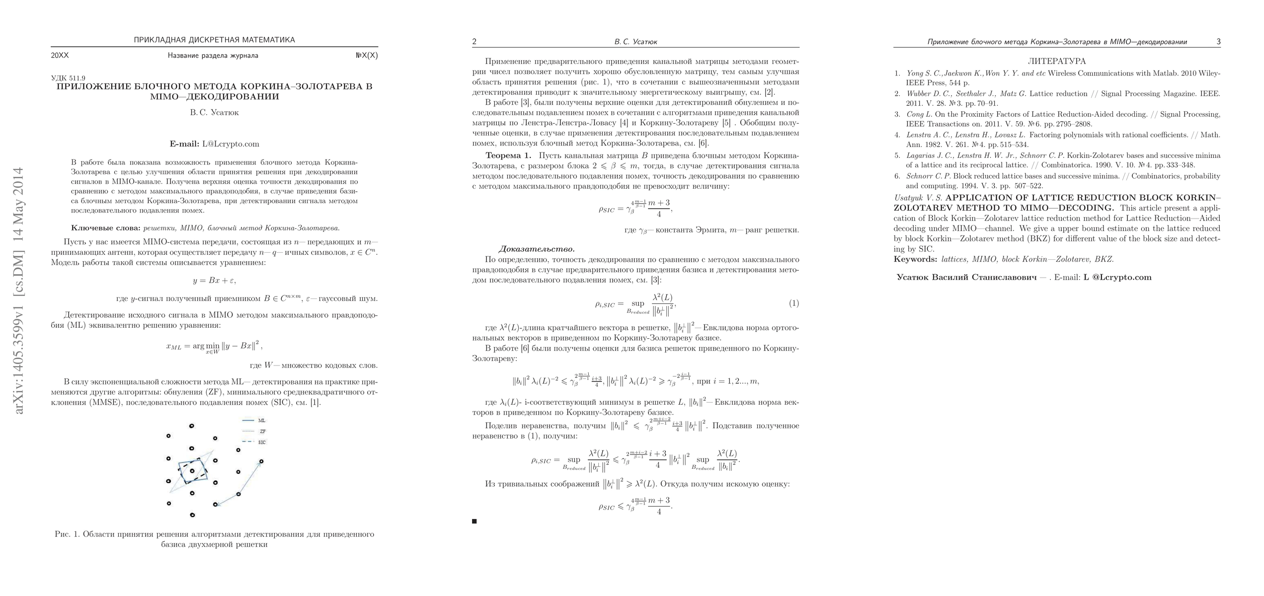 This article present a application of Block Korkin---Zolotarev lattice reduction method for Lattice Reduction---Aided decoding under MIMO---channel. We give a upper bound estimate on the lattice reduced by block Korkin---Zolotarev method (BKZ) for different value of the block size and detecting by SIC.