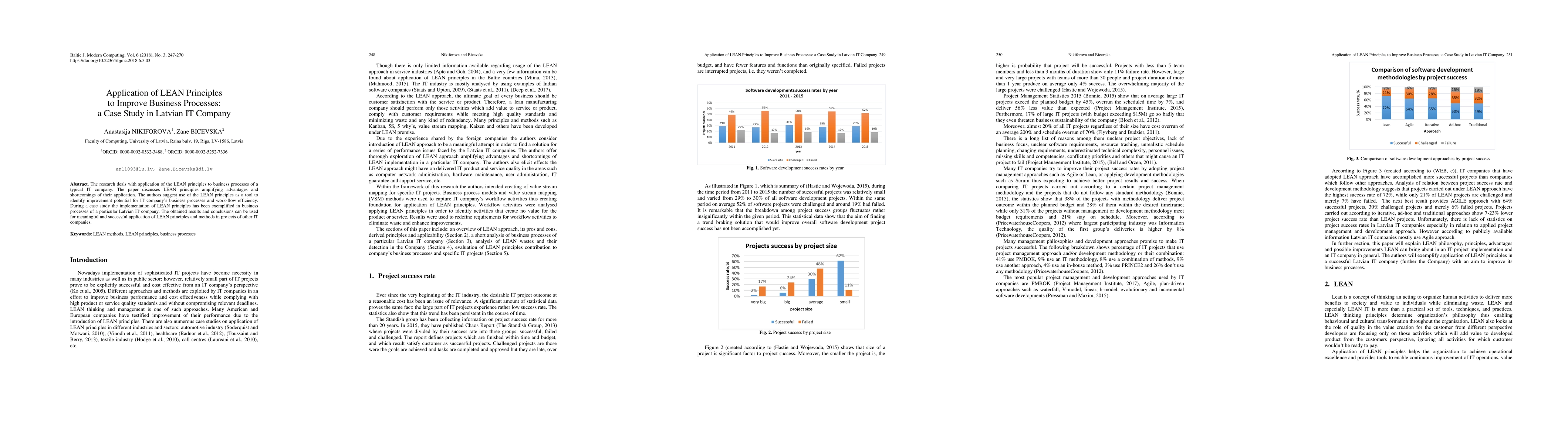 The research deals with application of the LEAN principles to business processes of a typical IT company. The paper discusses LEAN principles amplifying advantages and shortcomings of their application. The authors suggest use of the LEAN principles as a tool to identify improvement potential for IT company's business processes and work-flow efficiency. During a case study the implementation of LEAN principles has been exemplified in business processes of a particular Latvian IT company. The obtained results and conclusions can be used for meaningful and successful application of LEAN principles and methods in projects of other IT companies.