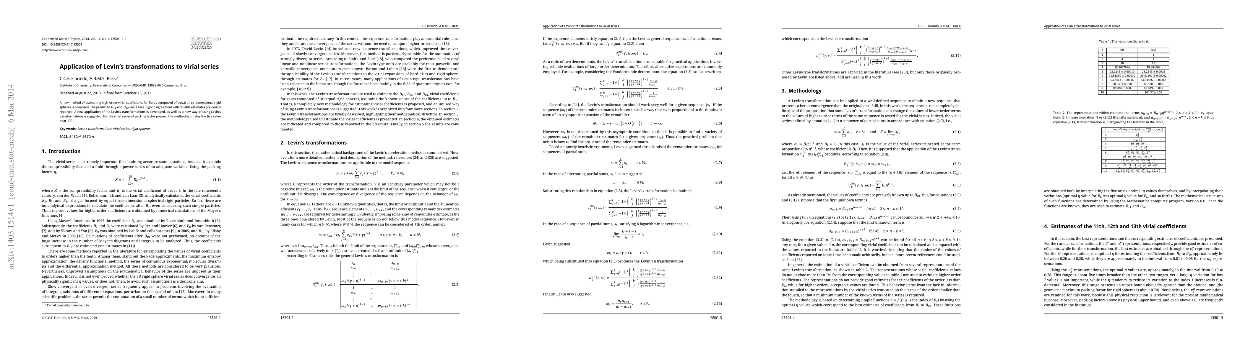 A new method for estimating high-order virial coefficients is proposed using Levin's transformations, with good agreement with previously reported values and a new estimate of B13 near 173.