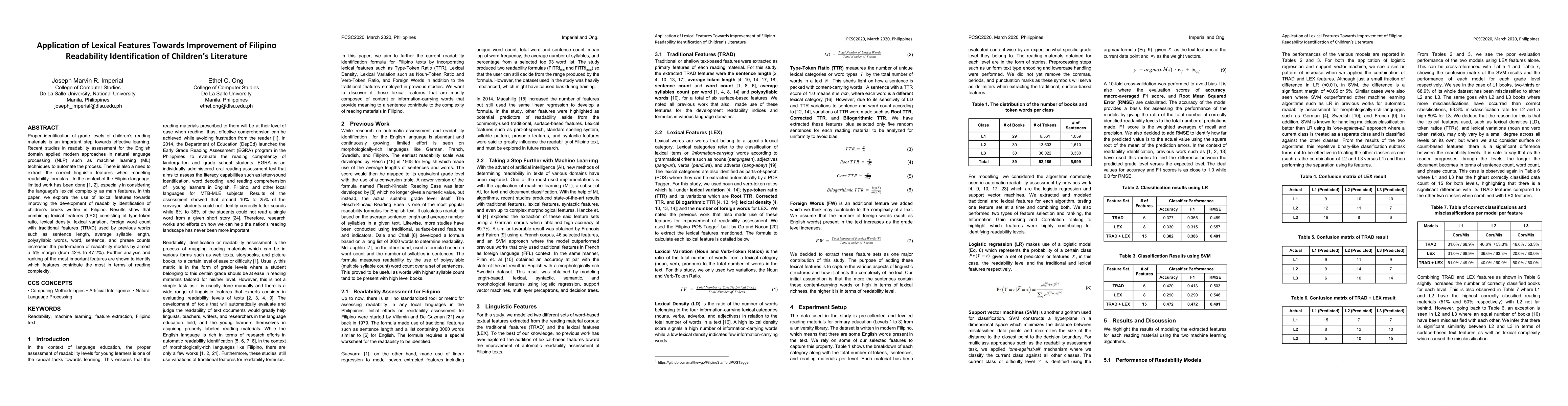 Proper identification of grade levels of children's reading materials is an important step towards effective learning. Recent studies in readability assessment for the English domain applied modern approaches in natural language processing (NLP) such as machine learning (ML) techniques to automate the process. There is also a need to extract the correct linguistic features when modeling readability formulas. In the context of the Filipino language, limited work has been done [1, 2], especially in considering the language's lexical complexity as main features. In this paper, we explore the use of lexical features towards improving the development of readability identification of children's books written in Filipino. Results show that combining lexical features (LEX) consisting of type-token ratio, lexical density, lexical variation, foreign word count with traditional features (TRAD) used by previous works such as sentence length, average syllable length, polysyllabic words, word, sentence, and phrase counts increased the performance of readability models by almost a 5% margin (from 42% to 47.2%). Further analysis and ranking of the most important features were shown to identify which features contribute the most in terms of reading complexity.