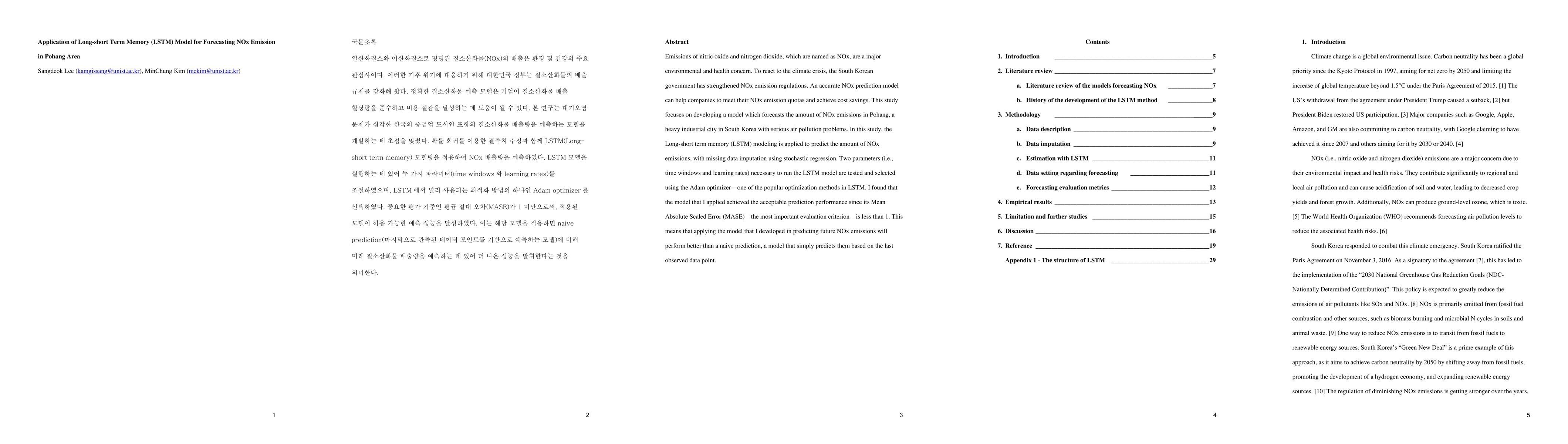 Emissions of nitric oxide and nitrogen dioxide, which are named as NOx, are a major environmental and health concern.To react to the climate crisis, the South Korean government has strengthened NOx emission regulations. An accurate NOx prediction model can help companies to meet their NOx emission quotas and achieve cost savings. This study focuses on developing a model which forecasts the amount of NOx emissions in Pohang, a heavy industrial city in South Korea with serious air pollution problems.In this study, the Long-short term memory (LSTM) modeling is applied to predict the amount of NOx emissions, with missing data imputation using stochastic regression. Two parameters (i.e., time windows and learning rates) necessary to run the LSTM model are tested and selected using the Adam optimizer, one of the popular optimization methods in LSTM. I found that the model that I applied achieved the acceptable prediction performance since its Mean Absolute Scaled Error (MASE), the most important evaluation criterion, is less than 1. This means that applying the model that I developed in predicting future NOx emissions will perform better than a naive prediction, a model that simply predicts them based on the last observed data point.