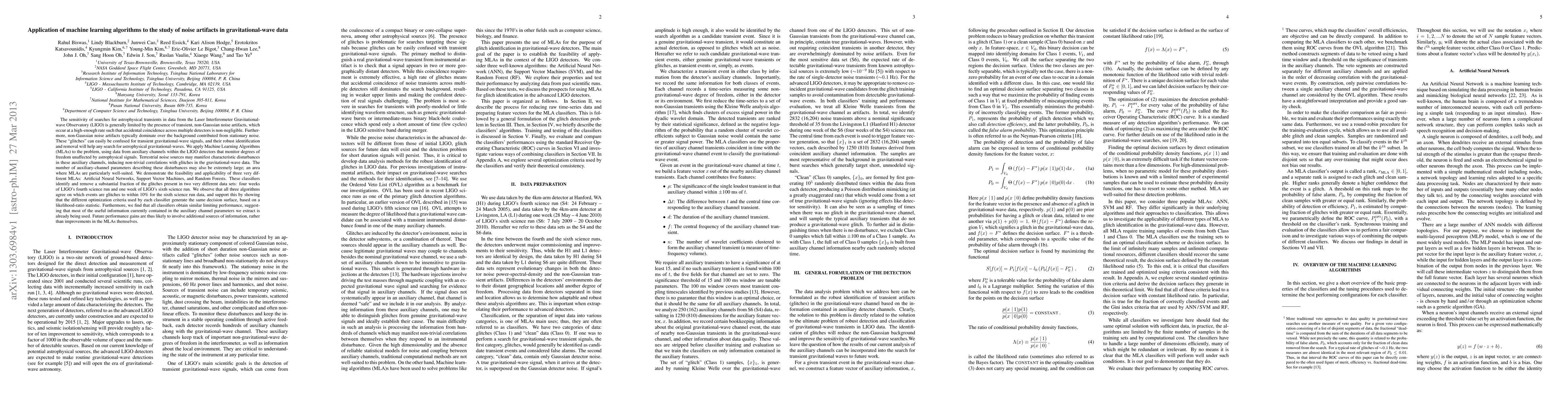 This paper explores the application of machine learning algorithms to identify and remove noise artifacts in LIGO gravitational-wave data, demonstrating the effectiveness of Artificial Neural Networks, Support Vector Machines, and Random Forests in distinguishing glitches from genuine signals. The study shows that these algorithms achieve similar performance, indicating that the auxiliary channel parameters are sufficiently informative for effective noise reduction.