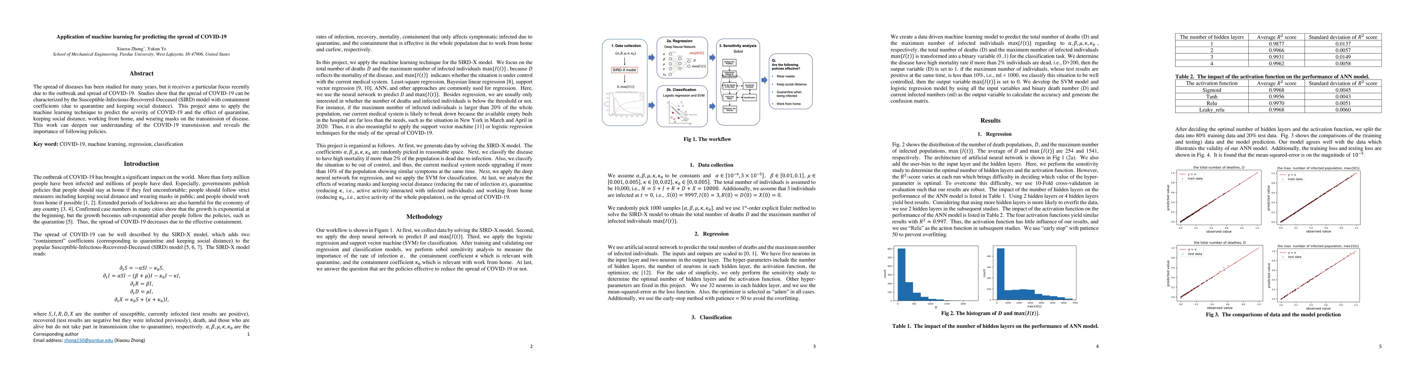 The spread of diseases has been studied for many years, but it receives a particular focus recently due to the outbreak and spread of COVID-19. Studies show that the spread of COVID-19 can be characterized by the Susceptible-Infectious-Recovered-Deceased (SIRD) model with containment coefficients (due to quarantine and keeping social distance). This project aims to apply the machine learning technique to predict the severity of COVID-19 and the effect of quarantine, keeping social distance, working from home, and wearing masks on the transmission of the disease. This work deepens our understanding of disease transmission and reveals the importance of following policies.