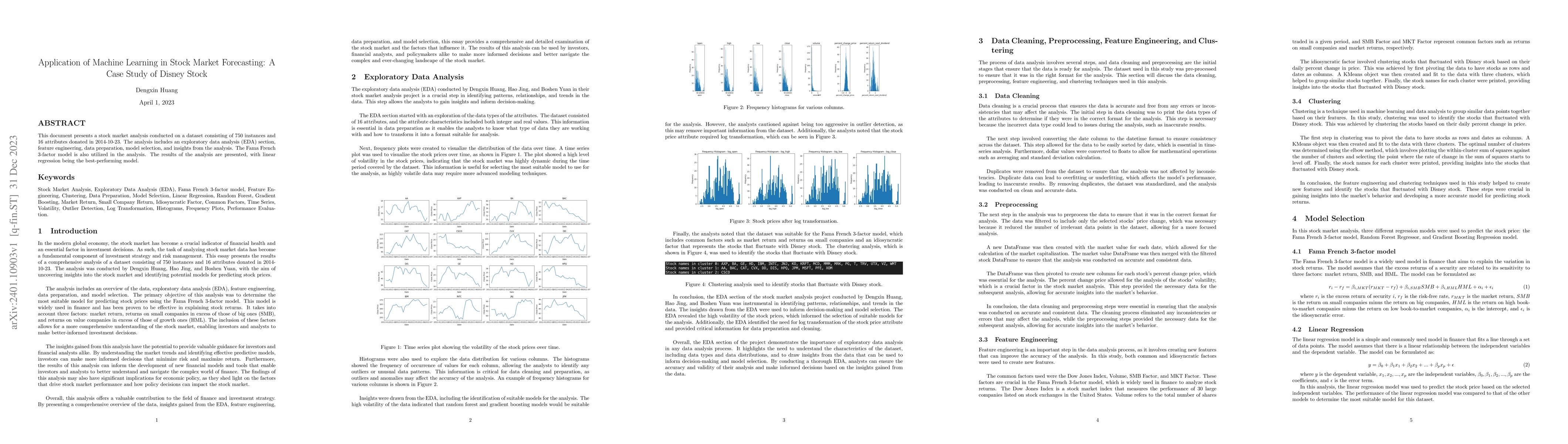 This document presents a stock market analysis conducted on a dataset consisting of 750 instances and 16 attributes donated in 2014-10-23. The analysis includes an exploratory data analysis (EDA) section, feature engineering, data preparation, model selection, and insights from the analysis. The Fama French 3-factor model is also utilized in the analysis. The results of the analysis are presented, with linear regression being the best-performing model.