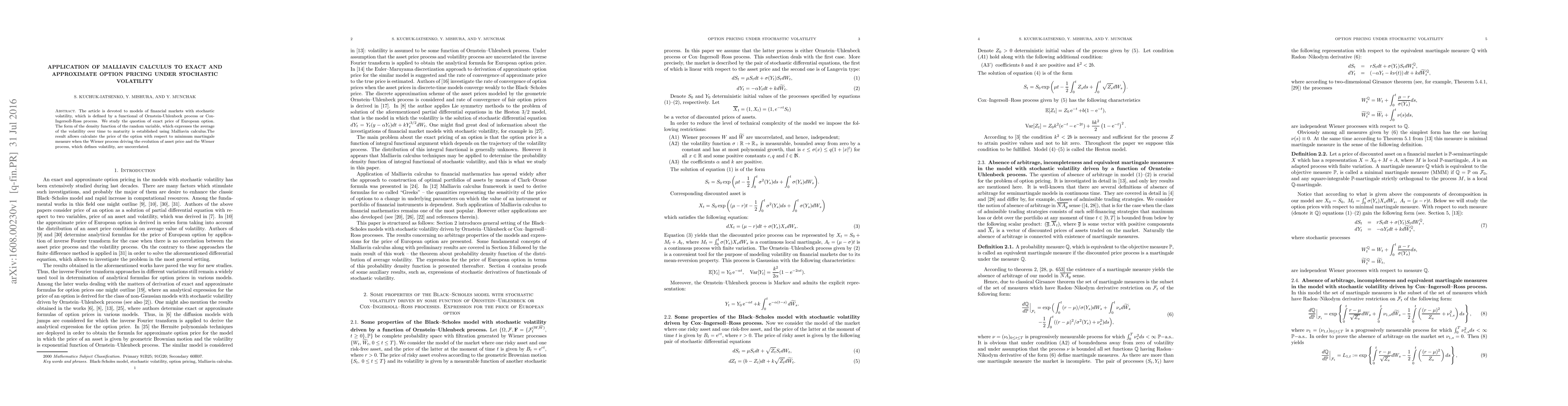 This paper applies Malliavin calculus to determine the exact price of European options in financial markets with stochastic volatility modeled by Ornstein-Uhlenbeck or Cox-Ingersoll-Ross processes. The study establishes the density function for the average volatility over time using Malliavin calculus, enabling option pricing under uncorrelated Wiener processes for asset price and volatility.