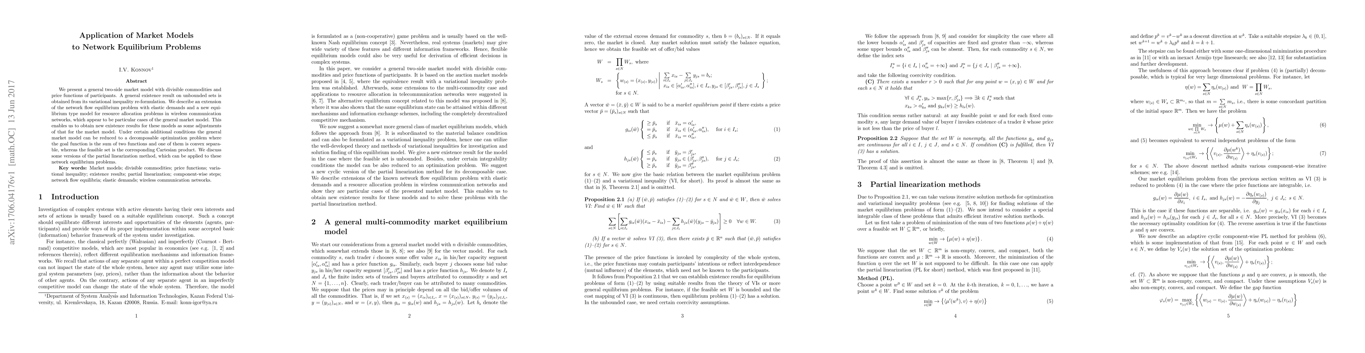 We present a general two-side market model with divisible commodities and price functions of participants. A general existence result on unbounded sets is obtained from its variational inequality re-formulation. We describe an extension of the network flow equilibrium problem with elastic demands and a new equilibrium type model for resource allocation problems in wireless communication networks, which appear to be particular cases of the general market model. This enables us to obtain new existence results for these models as some adjustments of that for the market model. Under certain additional conditions the general market model can be reduced to a decomposable optimization problem where the goal function is the sum of two functions and one of them is convex separable, whereas the feasible set is the corresponding Cartesian product. We discuss some versions of the partial linearization method, which can be applied to these network equilibrium problems.