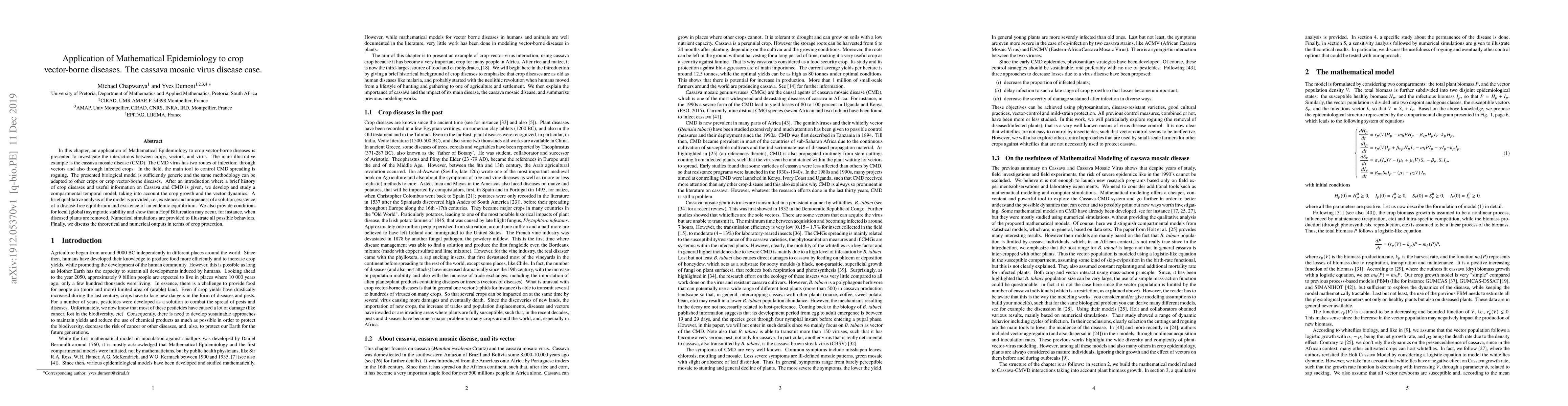 In this chapter, an application of Mathematical Epidemiology to crop vector-borne diseases is presented to investigate the interactions between crops, vectors, and virus. The main illustrative example is the cassava mosaic disease (CMD). The CMD virus has two routes of infection: through vectors and also through infected crops. In the field, the main tool to control CMD spreading is roguing. The presented biological model is sufficiently generic and the same methodology can be adapted to other crops or crop vector-borne diseases. After an introduction where a brief history of crop diseases and useful information on Cassava and CMD is given, we develop and study a compartmental temporal model, taking into account the crop growth and the vector dynamics. A brief qualitative analysis of the model is provided,i.e., existence and uniqueness of a solution,existence of a disease-free equilibrium and existence of an endemic equilibrium. We also provide conditions for local (global) asymptotic stability and show that a Hopf Bifurcation may occur, for instance, when diseased plants are removed. Numerical simulations are provided to illustrate all possible behaviors. Finally, we discuss the theoretical and numerical outputs in terms of crop protection.