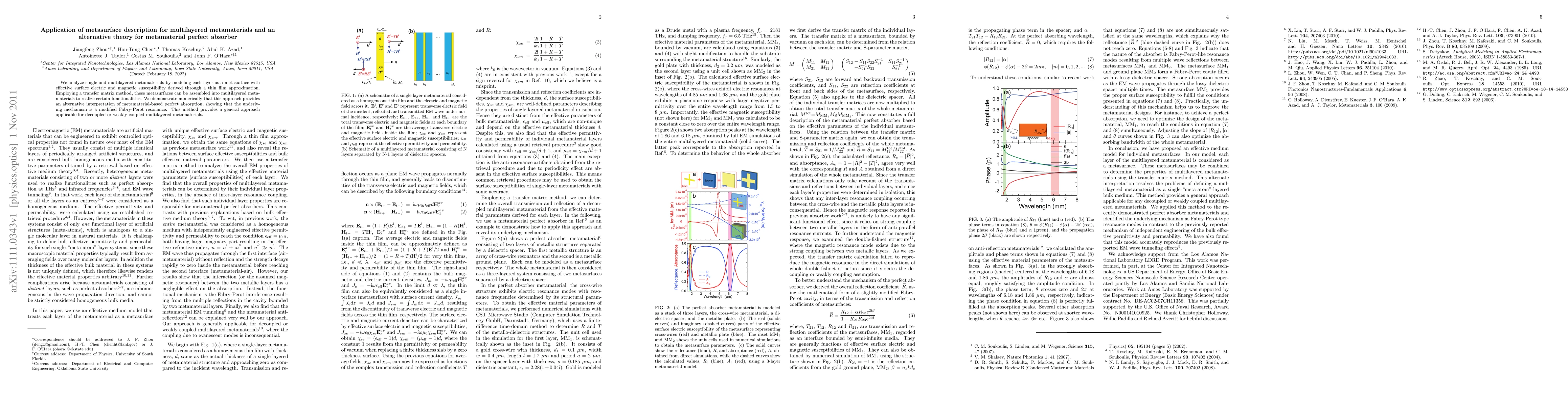 The paper proposes a metasurface description for multilayered metamaterials, using effective surface susceptibilities and transfer matrix methods to achieve functionalities like perfect absorption, which is reinterpreted as a modified Fabry-Perot resonance. This approach is applicable to decoupled or weakly coupled multilayered systems.