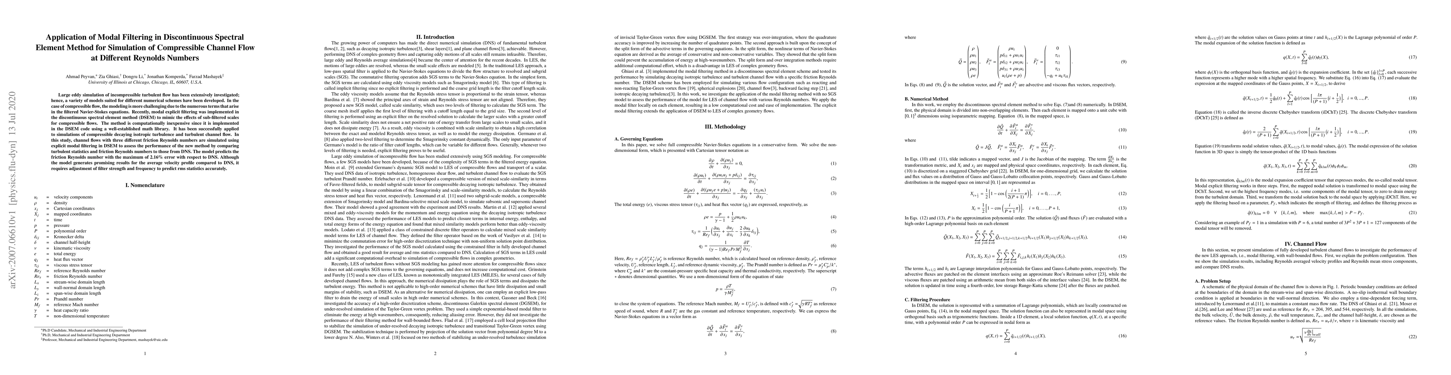 This study applies modal filtering within the discontinuous spectral element method (DSEM) to simulate compressible channel flow at various Reynolds numbers, achieving accurate predictions of friction Reynolds numbers with minimal computational cost. The method shows promise for average velocity profiles but requires tuning of filter parameters for precise root-mean-square statistics.