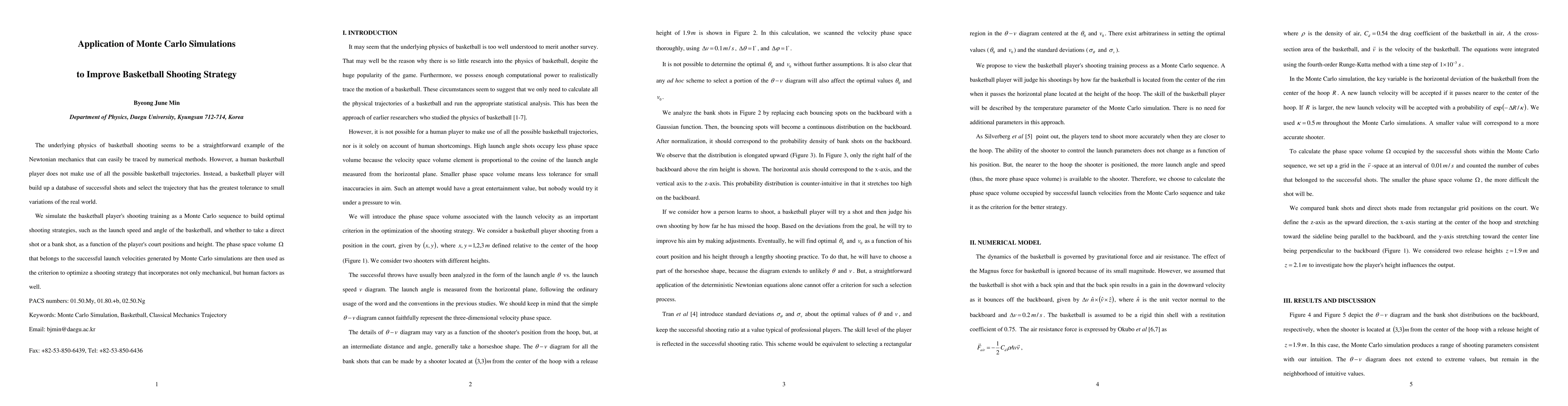 This paper uses Monte Carlo simulations to develop optimal basketball shooting strategies by modeling the player's shooting training and selecting trajectories that are most resilient to real-world variations. The simulations optimize launch speed, angle, and shot type based on player position and height.