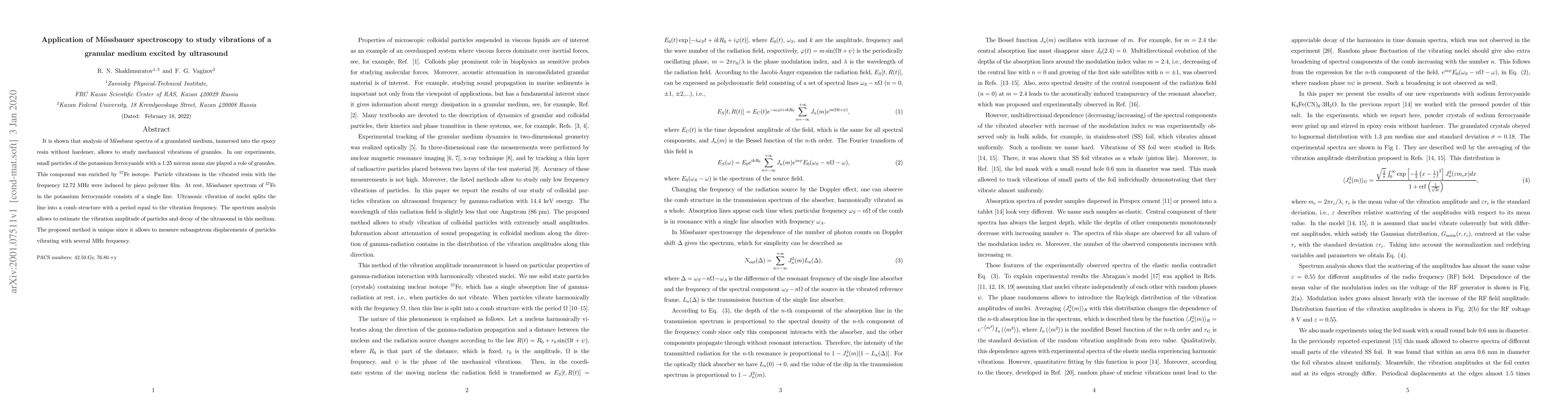 It is shown that analysis of M\"{o}ssbaur spectra of a granulated medium, immersed into the epoxy resin without hardener, allows to study mechanical vibrations of granules. In our experiments, small particles of the potassium ferrocyanide with a 1.25 micron mean size played a role of granules. This compound was enriched by $^{57}$Fe isotope. Particle vibrations in the vibrated resin with the frequency 12.72 MHz were induced by piezo polymer film. At rest, M\"{o}ssbauer spectrum of $^{57}$Fe in the potassium ferrocyanide consists of a single line. Ultrasonic vibration of nuclei splits the line into a comb structure with a period equal to the vibration frequency. The spectrum analysis allows to estimate the vibration amplitude of particles and decay of the ultrasound in this medium. The proposed method is unique since it allows to measure subangstrom displacements of particles vibrating with several MHz frequency.