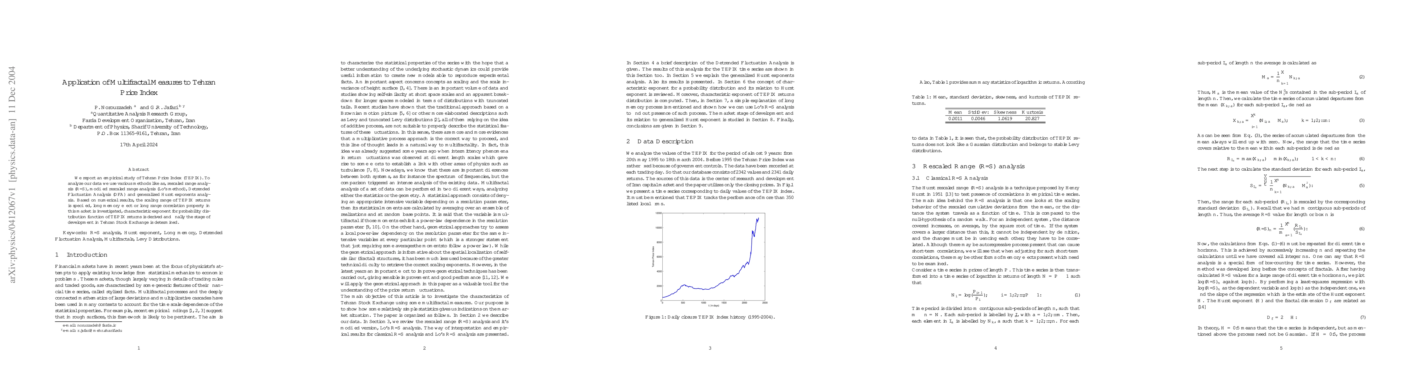 This study applies multifractal measures to analyze Tehran Price Index returns, finding evidence of long memory effect and a characteristic exponent for the probability distribution function.