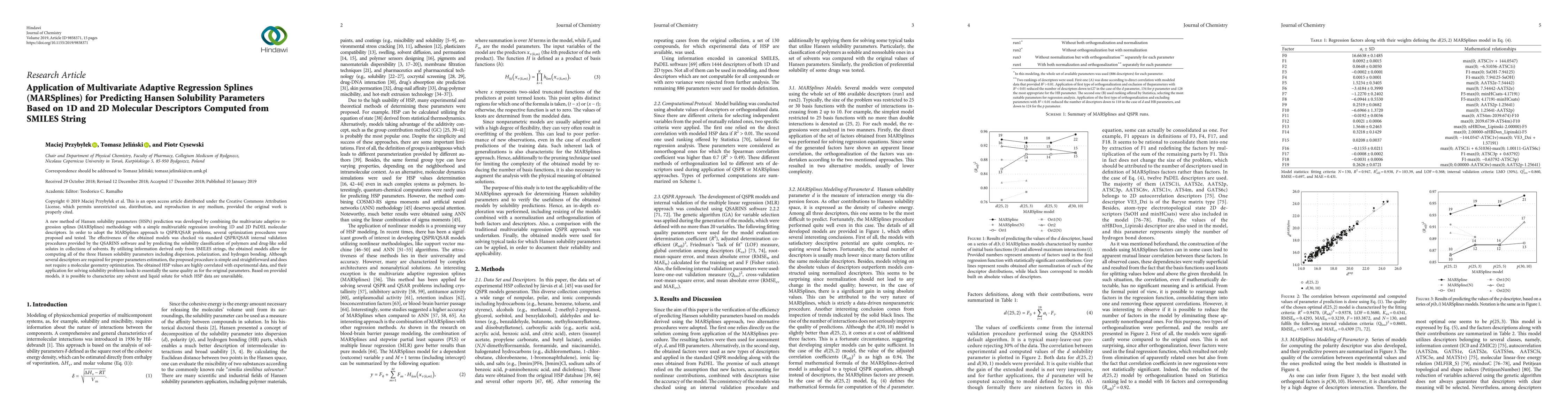 A new method of Hansen solubility parameters (HSPs) prediction was developed by combining the multivariate adaptive regression splines (MARSplines) methodology with a simple multivariable regression involving 1D and 2D PaDEL molecular descriptors. In order to adopt the MARSplines approach to QSPR/QSAR problems, several optimization procedures were proposed and tested. The effectiveness of the obtained models was checked via standard QSPR/QSAR internal validation procedures provided by the QSARINS software and by predicting the solubility classification of polymers and drug-like solid solutes in collections of solvents. By utilizing information derived only from SMILES strings, the obtained models allow for computing all of the three Hansen solubility parameters including dispersion, polarization, and hydrogen bonding. Although several descriptors are required for proper parameters estimation, the proposed procedure is simple and straightforward and does not require a molecular geometry optimization. The obtained HSP values are highly correlated with experimental data, and their application for solving solubility problems leads to essentially the same quality as for the original parameters. Based on provided models, it is possible to characterize any solvent and liquid solute for which HSP data are unavailable.
