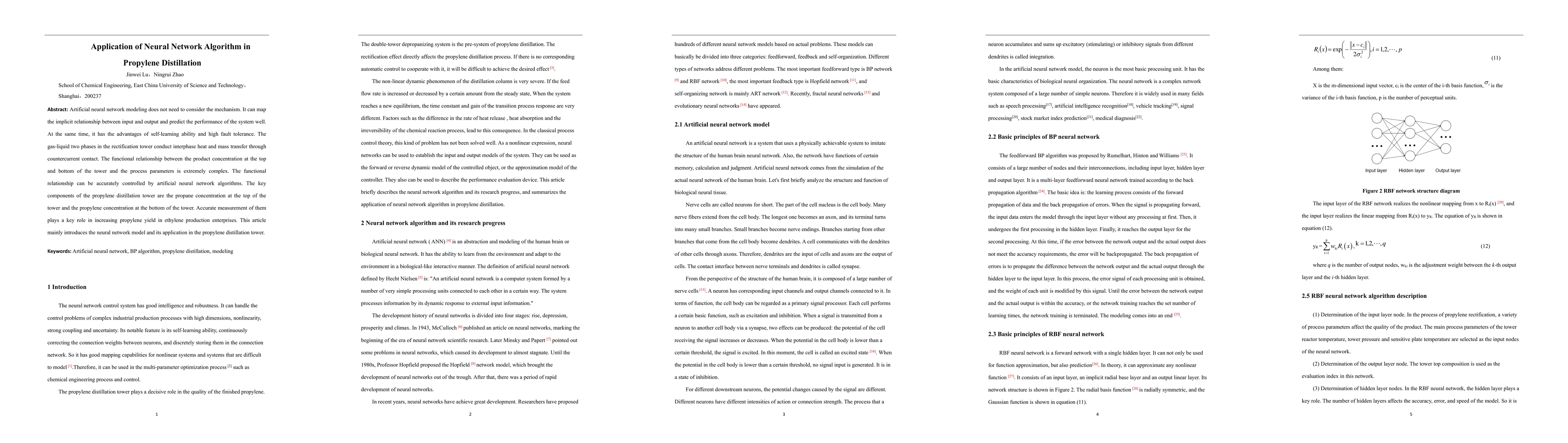 Artificial neural network modeling does not need to consider the mechanism. It can map the implicit relationship between input and output and predict the performance of the system well. At the same time, it has the advantages of self-learning ability and high fault tolerance. The gas-liquid two phases in the rectification tower conduct interphase heat and mass transfer through countercurrent contact. The functional relationship between the product concentration at the top and bottom of the tower and the process parameters is extremely complex. The functional relationship can be accurately controlled by artificial neural network algorithms. The key components of the propylene distillation tower are the propane concentration at the top of the tower and the propylene concentration at the bottom of the tower. Accurate measurement of them plays a key role in increasing propylene yield in ethylene production enterprises. This article mainly introduces the neural network model and its application in the propylene distillation tower.