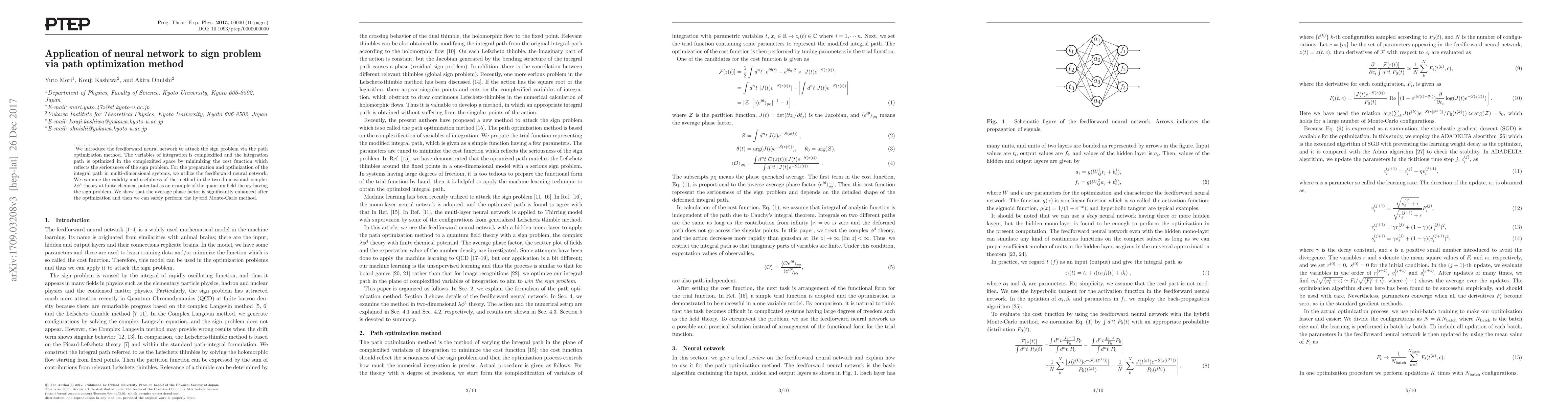 We introduce the feedforward neural network to attack the sign problem via the path optimization method. The variables of integration is complexified and the integration path is optimized in the complexified space by minimizing the cost function which reflects the seriousness of the sign problem. For the preparation and optimization of the integral path in multi-dimensional systems, we utilize the feedforward neural network. We examine the validity and usefulness of the method in the two-dimensional complex $\lambda \phi^4$ theory at finite chemical potential as an example of the quantum field theory having the sign problem. We show that the average phase factor is significantly enhanced after the optimization and then we can safely perform the hybrid Monte-Carlo method.