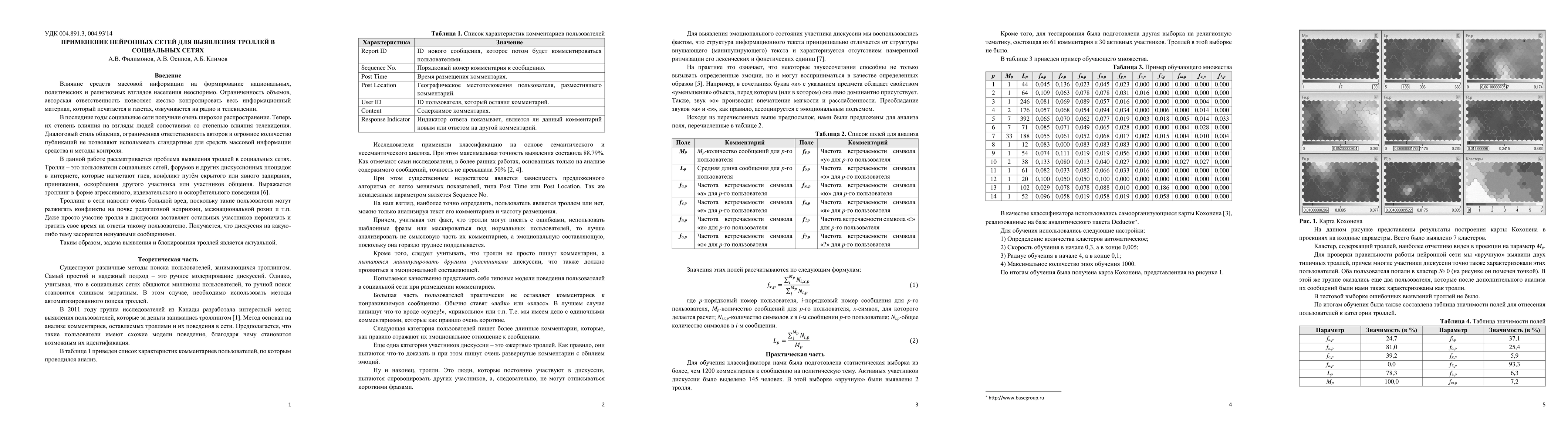 In this paper we developed and tested a new algorithm of detecting in social networks users (so-called trolls) who behave in an insulting and provocative way towards other users. In order to detect trolls it is proposed to unite users in groups where all the members have a similar way of communicating. Defining the number of group and distributing the users into these groups is carried out automatically due to application of neural networks of special type - Kohonens self-organized maps. As for users characteristics according to which the distribution into groups might be done we suggest using such data as the number of comments, the average comment length and indicators determining the emotional state of the user (the frequency of encountering certain characters in comments).