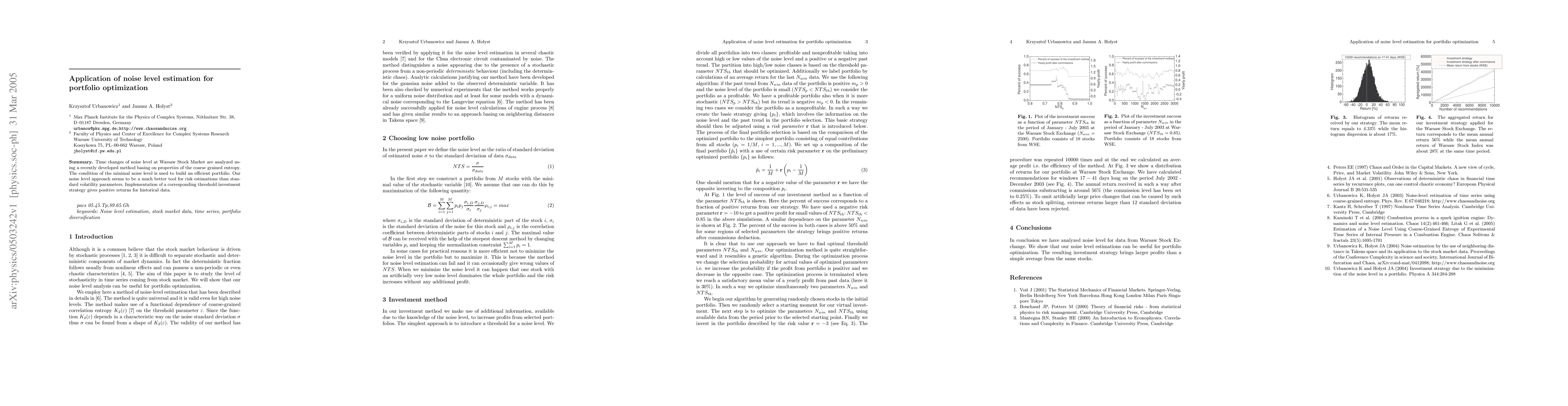 Time changes of noise level at Warsaw Stock Market are analyzed using a recently developed method basing on properties of the coarse grained entropy. The condition of the minimal noise level is used to build an efficient portfolio. Our noise level approach seems to be a much better tool for risk estimations than standard volatility parameters. Implementation of a corresponding threshold investment strategy gives positive returns for historical data.