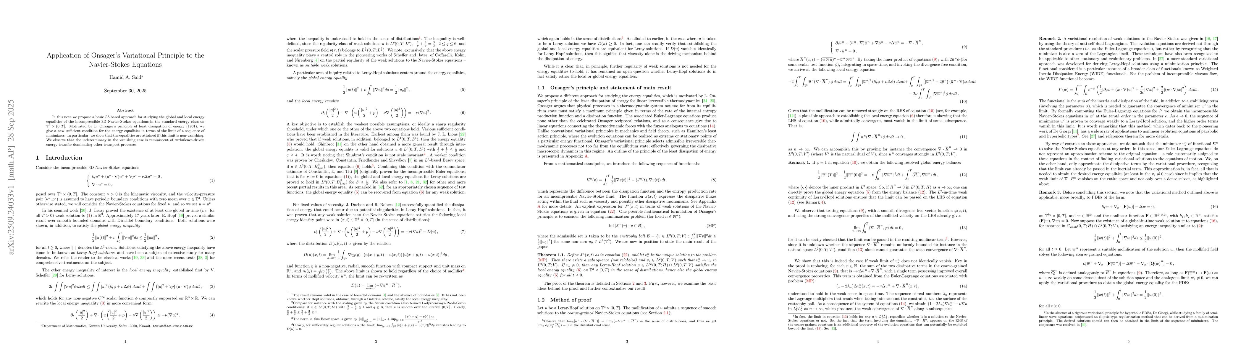 The paper develops a variational formulation of the Navier-Stokes equations using Onsager's principle, establishes conditions for energy conservation, and provides convergence results for minimizing sequences.